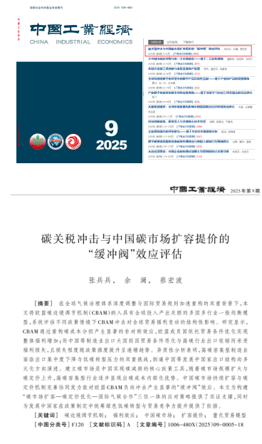 近日,英国365官网张兵兵教授团队合作论文《碳关税冲击与中国碳市场扩容提价的“缓冲阀”效应评估》在应用经济学和管理学类综合性权威理论期刊《中国工业经济》第9期首篇刊发。