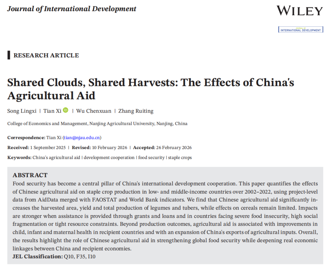 近日,学院田曦教授指导的本科生团队,由宋凌晰、吴晨萱、张瑞婷三位同学合作完成的论文" Shared Clouds, Shared Harvests: The Effects of China's Agricultural Aid "(共同作者,按姓氏首字母排序),在国际发展经济学领域知名期刊《Journal of International Development》在线发表。该研究最初以省级大学生创新训练计划课题立项,三位同学在导师的指导下分工协作、优势互补,历时一年有余,经过系统的数据收集、模型构建与多轮修改,最终打磨出了一篇经同行评审的学术论文。这支本科生团队完整经历了学术研究的全过程,充分彰显了英国365官网本科生参与前沿学术研究的能力与素养。