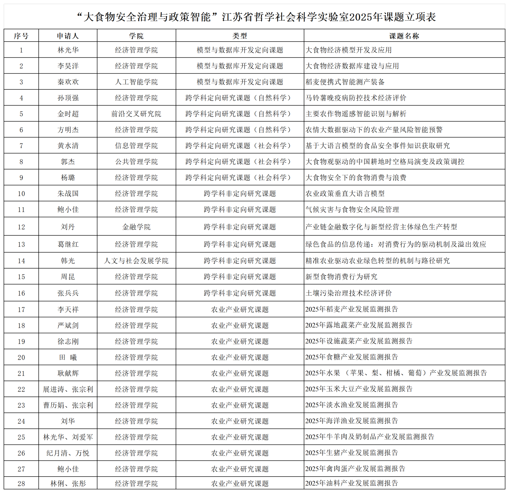 经个人申报、院学术委员会组织专家评审、并报院党政联席会议审议通过,现将“大食物安全治理与政策智能”江苏省哲学社会科学实验室2025年度课题予以公布。2025年度实验室课题共立项28项,实验室运行管理委员会对课题进行全程管理和跟踪督促。