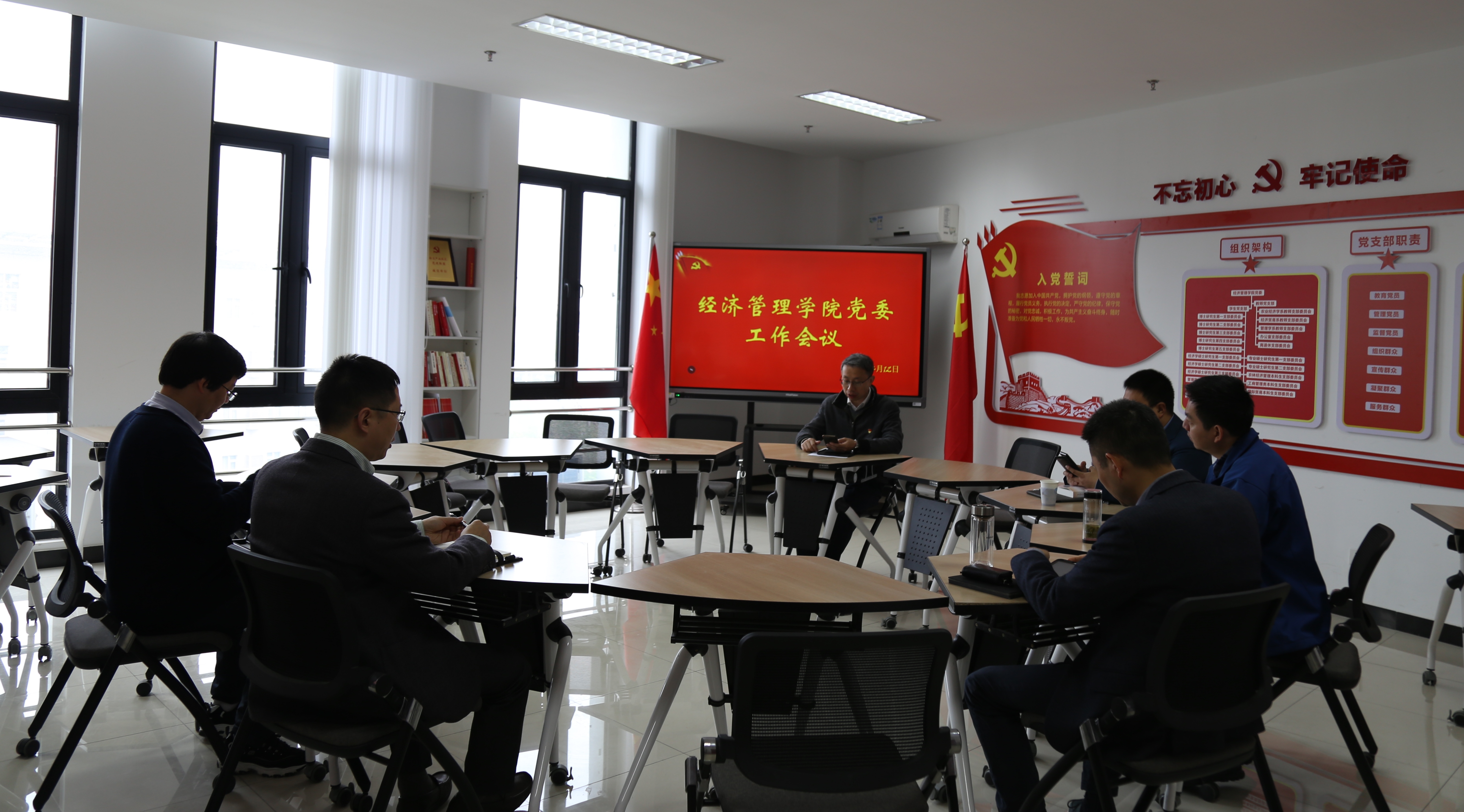 2021年4月12日,英国正版365官方网站党委召开工作会议专题研究教职工党支部换届选举及党史学习教育重要事宜。院党委书记姜海主持会议,党委副书记宋俊峰,党委委员林光华、易福金、徐志刚、展进涛参加会议。