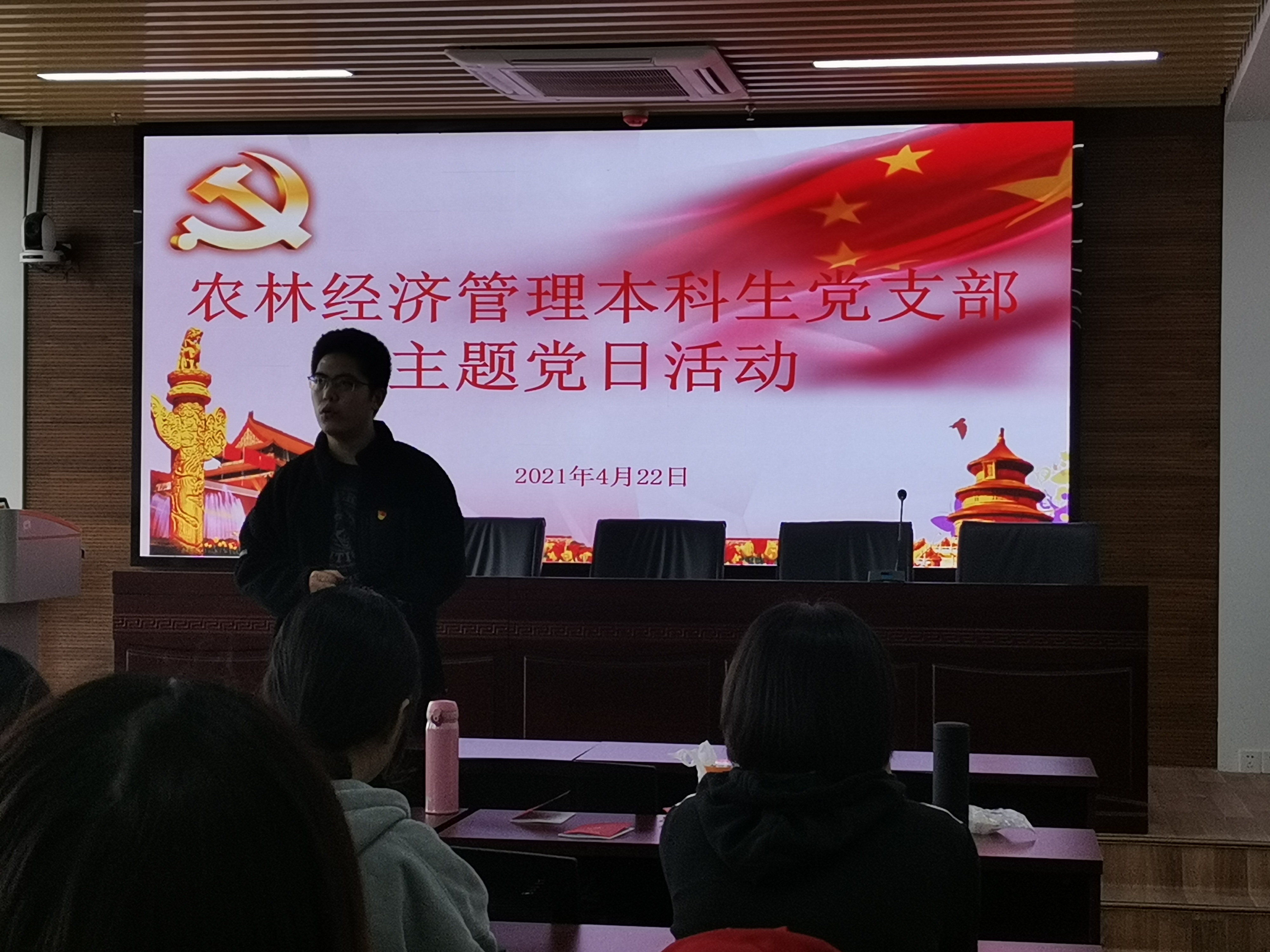 4月22日中午,农林经济管理本科生党支部在第三实验楼706会议室组织开展与时代同向同行,做合格青年党员主题党日。会议由党支部书记朱熠晟主持。