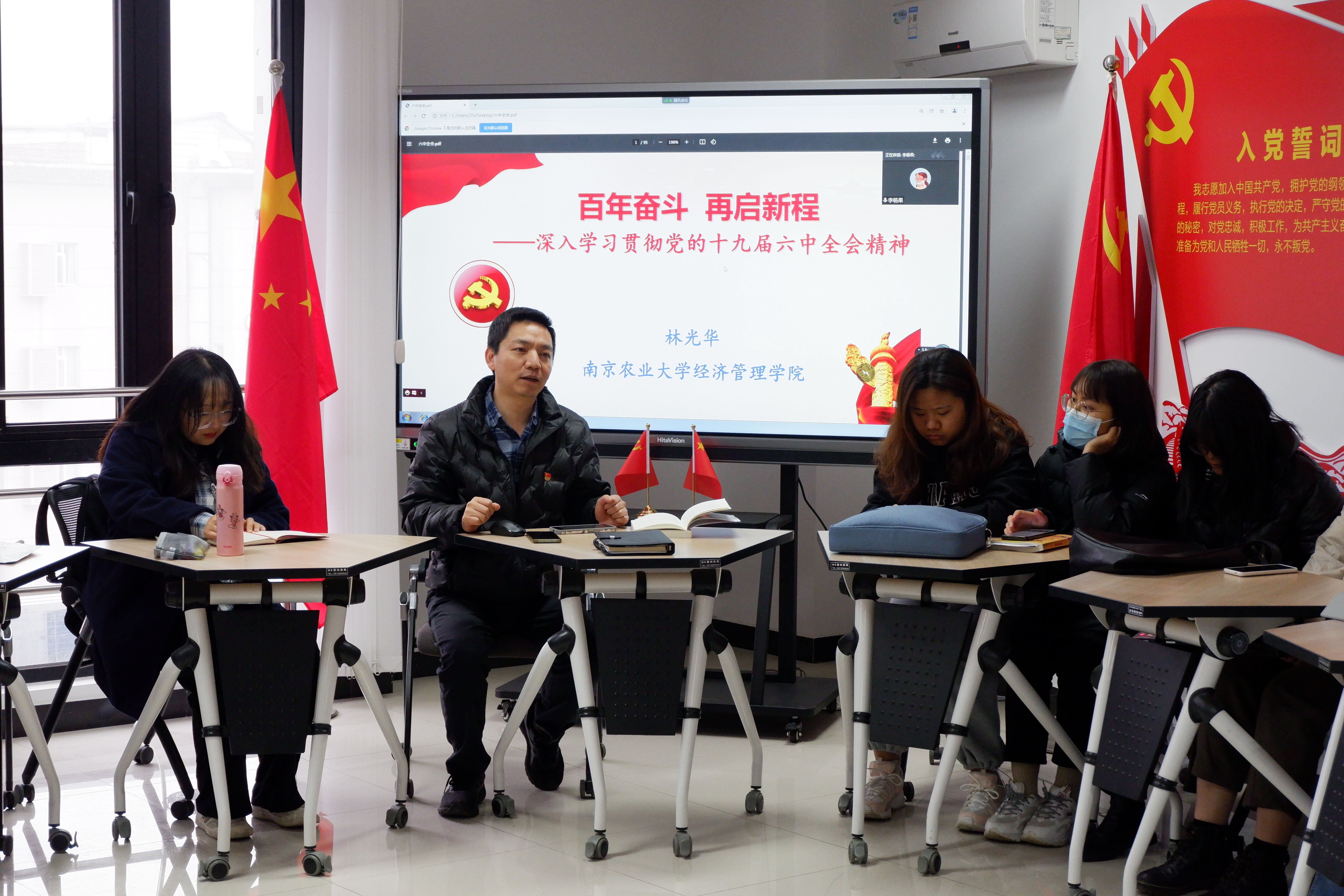 2021年12月12日下午,专业硕士研究生第一党支部于第三实验楼725党员实境课堂开展学习党的十九届六中全会精神主题党日,联系支部的院党委委员、副院长林光华教授为支部党员上了一堂《百年奋斗 再启新程——深入学习贯彻党的十九届六中全会精神》专题党课。