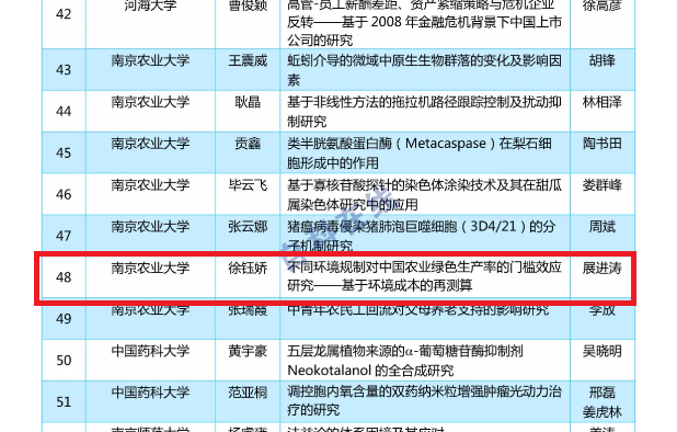 我校有7篇学术学位硕士论文获评优秀,其中1篇由英国365官网硕士生徐钰娇写作,题目为《不同环境规制对中国农业绿色生产率的门槛效应研究——基于环境成本的再测算》,导师为展进涛教授。
