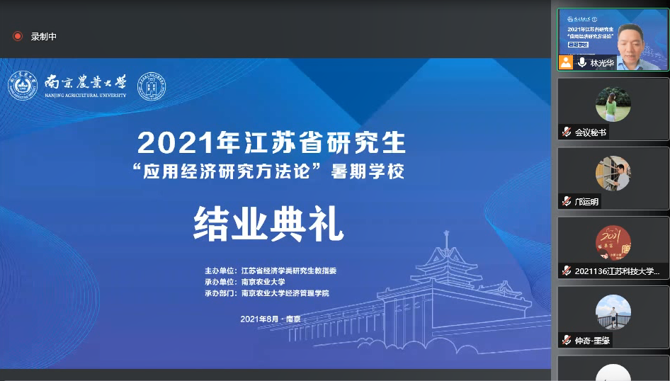 8月28日下午5点,2021年江苏省研究生“应用经济研究方法论”暑期学校线上结业典礼成功举行。结业典礼由英国正版365官方网站英国正版365官方网站副院长林光华教授主持。经过严格考核,本次暑期学校共批准了425名学员结业,评选出53名优秀学员,林光华教授在线宣布了优秀学员名单。