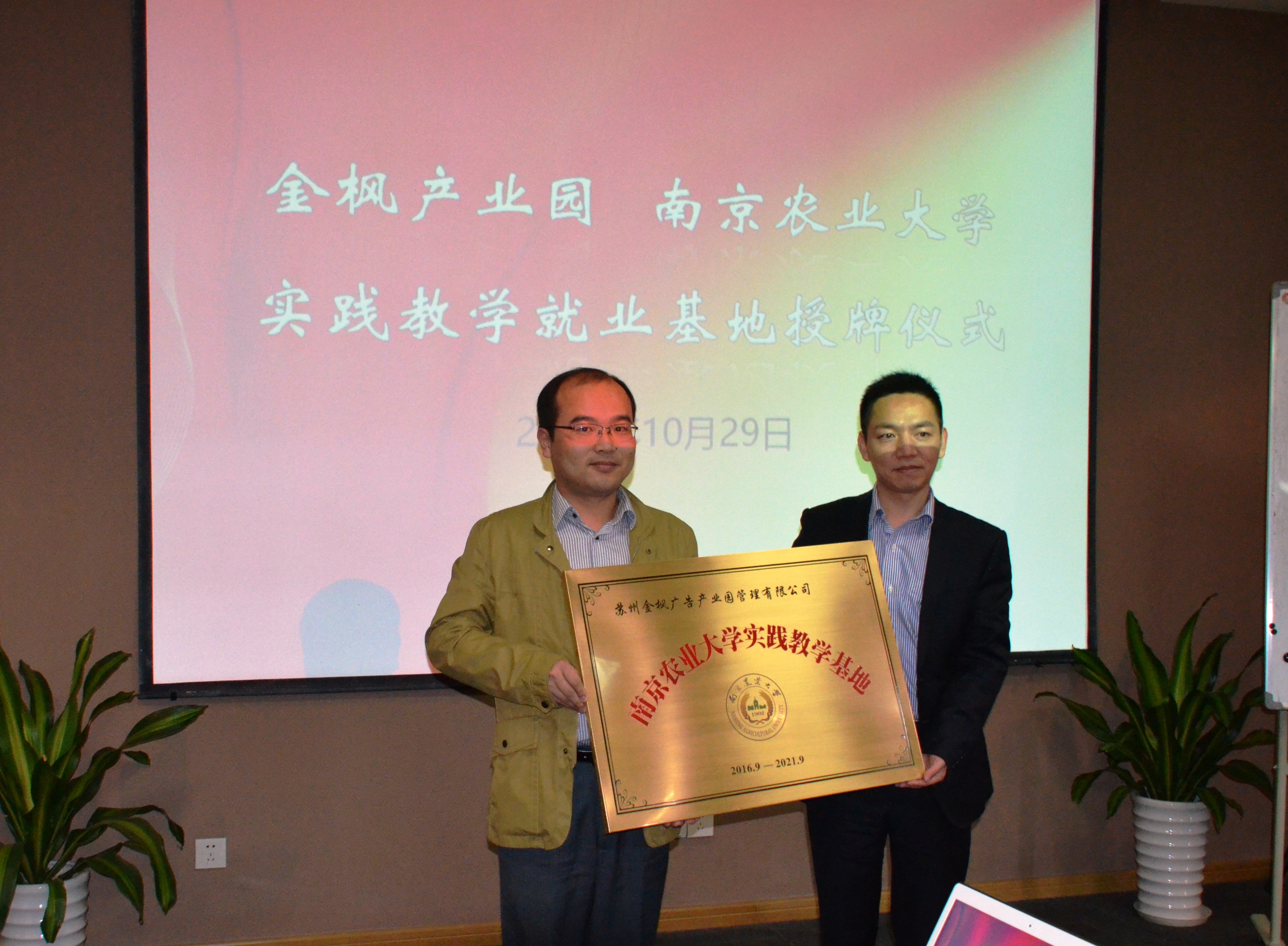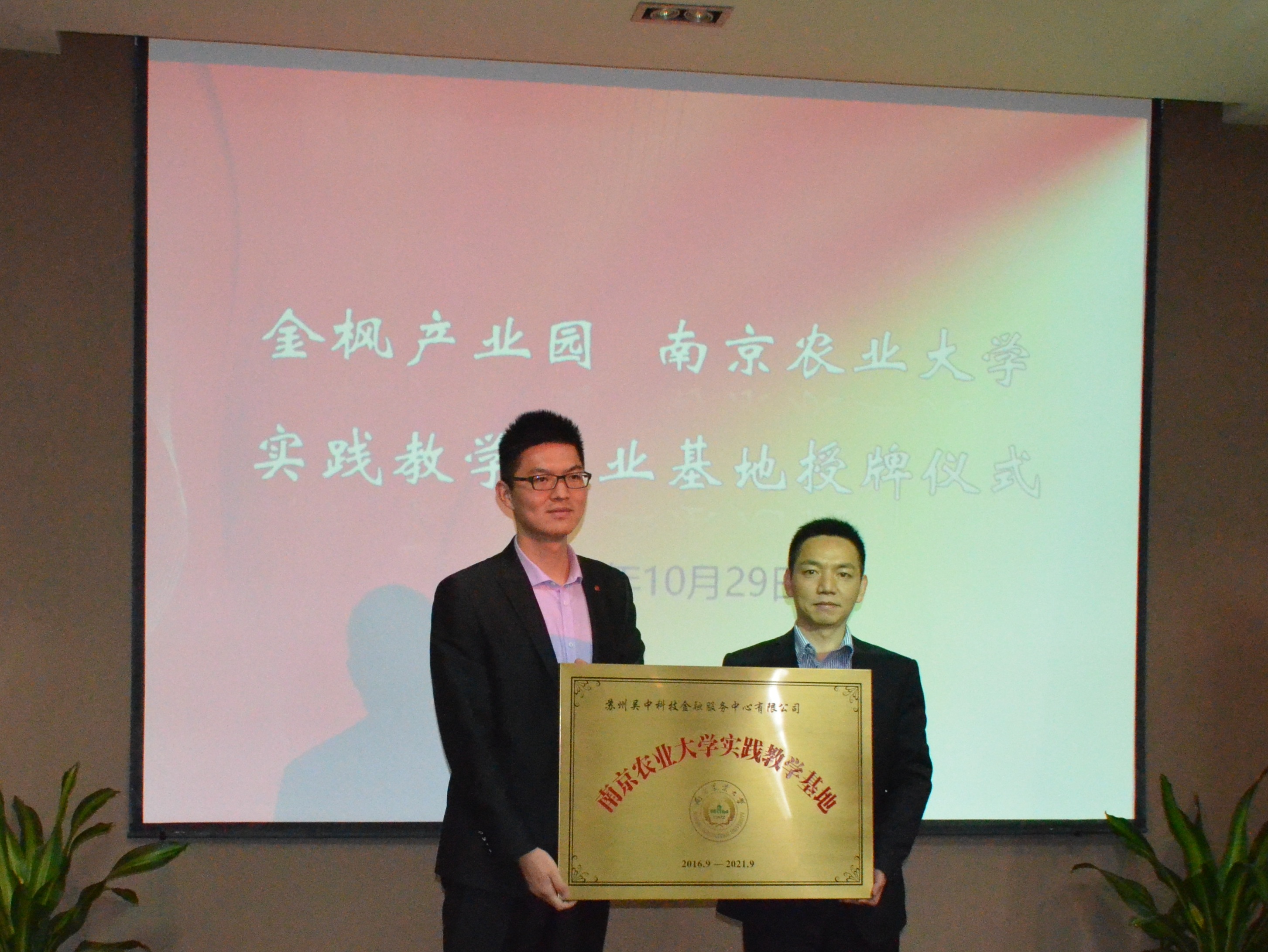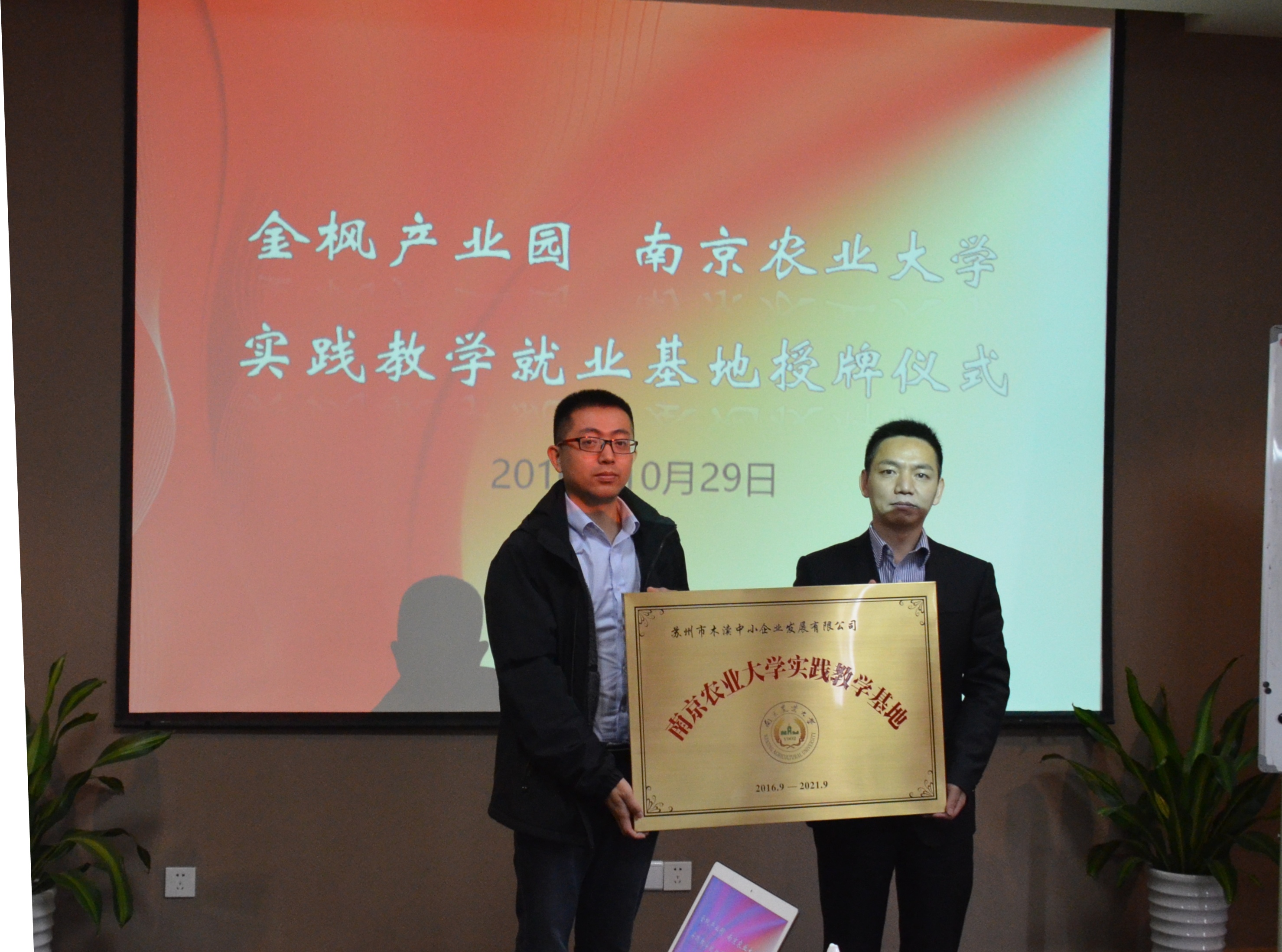 英国正版365官方网站副院长林光华代表学校与金枫产业园进行了“英国正版365官方网站—金枫产业园实践教学就业基地”授牌仪式,管理系系主任何军参加签约仪式。