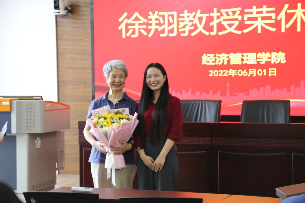 青年教师卢娟副教授为徐翔教授敬献鲜花。