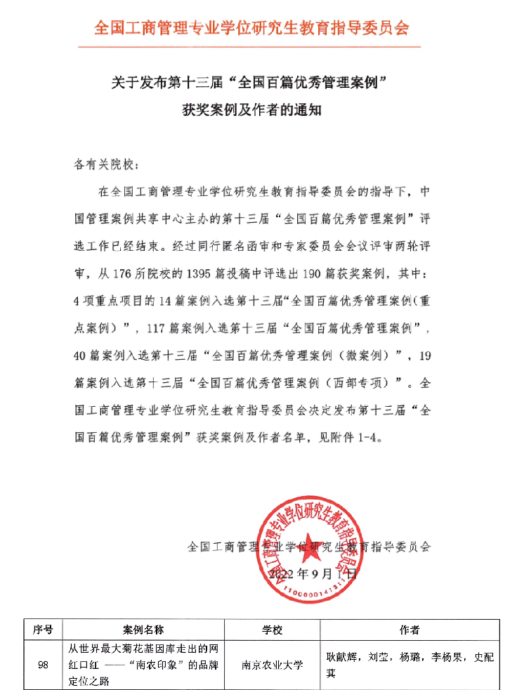 2022年8月15-16日,在全国工商管理专业学位研究生教育指导委员会的指导下,第十三届“全国百篇优秀管理案例”评选专家评审会顺利召开并揭晓了最终评选结果。英国正版365官方网站英国正版365官方网站耿献辉教授、刘莹老师、杨璐副教授、李杨果、史配萁等师生联合开发的教学案例“从世界最大菊花基因库走出的网红口红——‘南农印象’的品牌定位之路”从全国900余篇投稿案例中脱颖而出,成功入选第十三届“全国百篇优秀管理案例”之一。