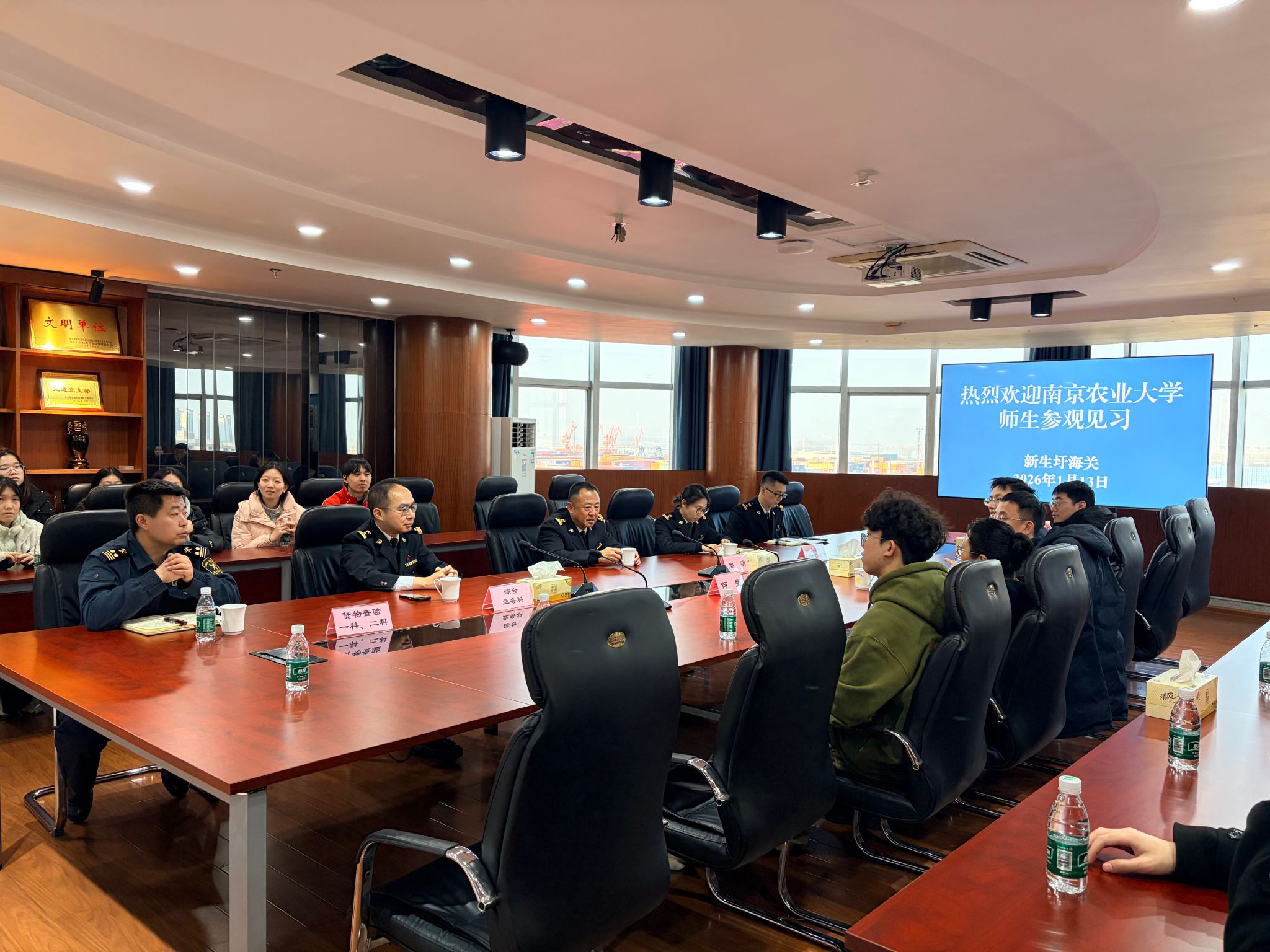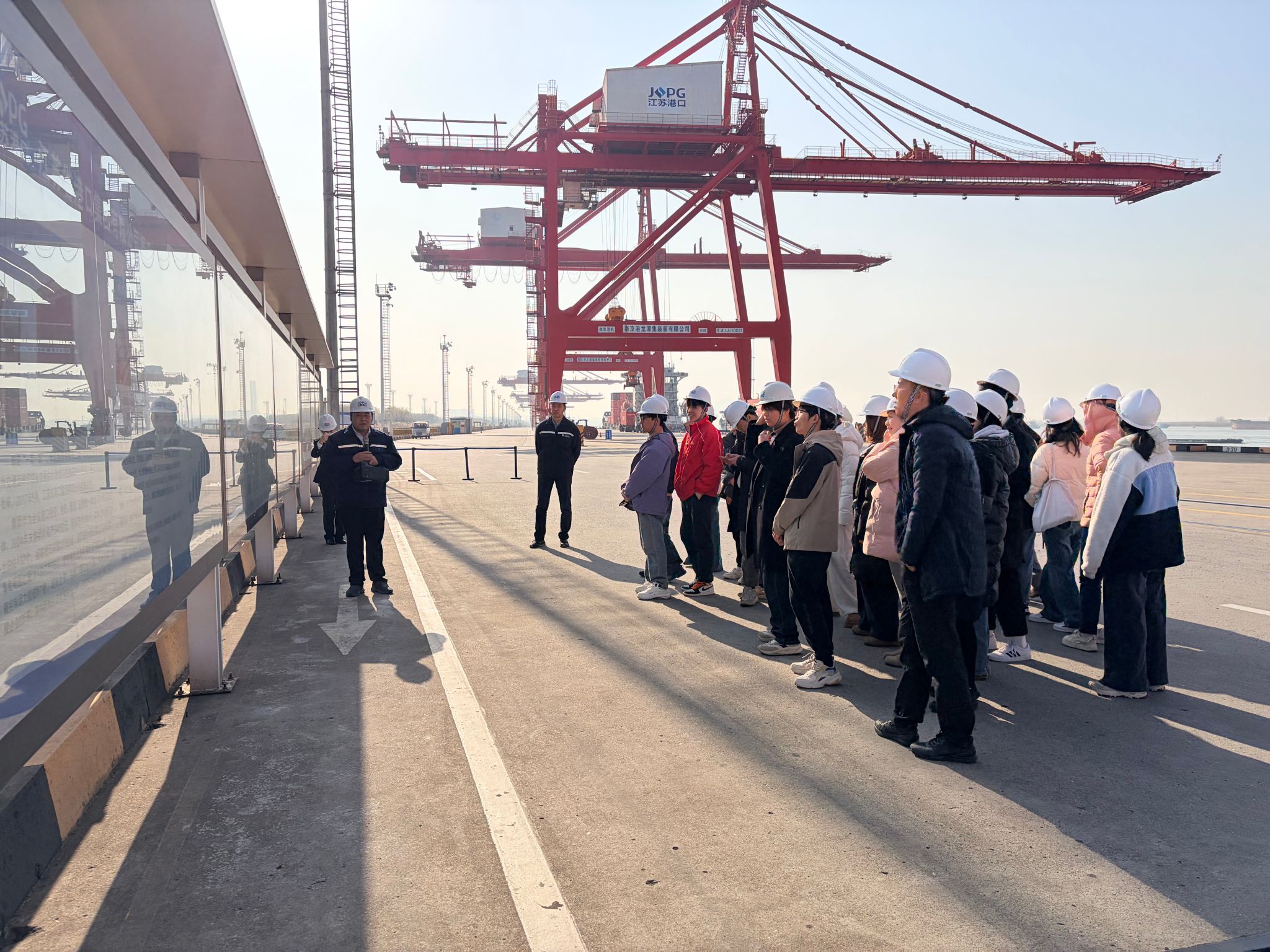 1月13-15日,一场以“跨境贸易全流程”为主题的专业认知实习,正在南京新生圩海关辖区的龙潭跨境电商产业园、龙潭集装箱码头等地开展。学院国贸23级学生分别在王学君、何曼;方明杰、施宇老师的带领下,师生一行约60人前往新生圩海关及周边港区进行基地参访调研。“原来这就是跨境电商的‘多式联运’,今天亲眼见到货物如何通关、数据如何分析,贸易全链条这个概念顿时立体了。”国际贸易专业大二学生江振宇说。这正是学院实践周中最寻常却生动的一幕。师生一行考察了龙潭港区进港铁路专用线,观摩了铁水联运作业现场。多式联运模式如何降低物流成本、提升运输效能,在这一环节变得具体可感。海关关员带领大家依次参观货物查验一科、二科、综合业务科及统计分析科,并进行了生动讲解。在业务窗口,师生了解到征税、贸易管制及单证审核的职责分工;在统计分析科,关员展示了如何通过数据监测分析中美、欧盟、东盟等市场的贸易动态,尤其关注太阳能、锂电池等重点商品的进出口走势。在答疑环节,三位同学分别就海关监管趋势、数据报送规范及职业发展路径提问,关员们予以细致解答,现场互动踊跃。海关之行是一堂“行走的专业课”,让抽象的制度条款变为可触摸的工作现场,希望同学们能从中体会国际贸易的规则之实、链路之深与数据之用。