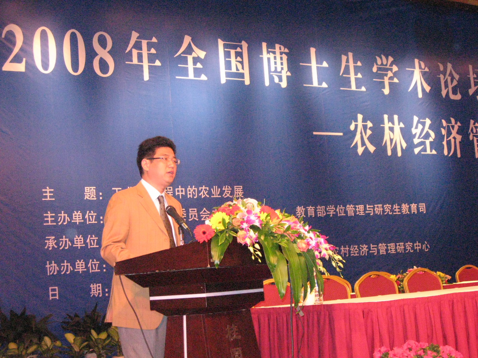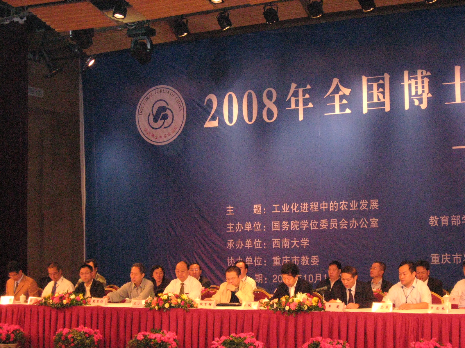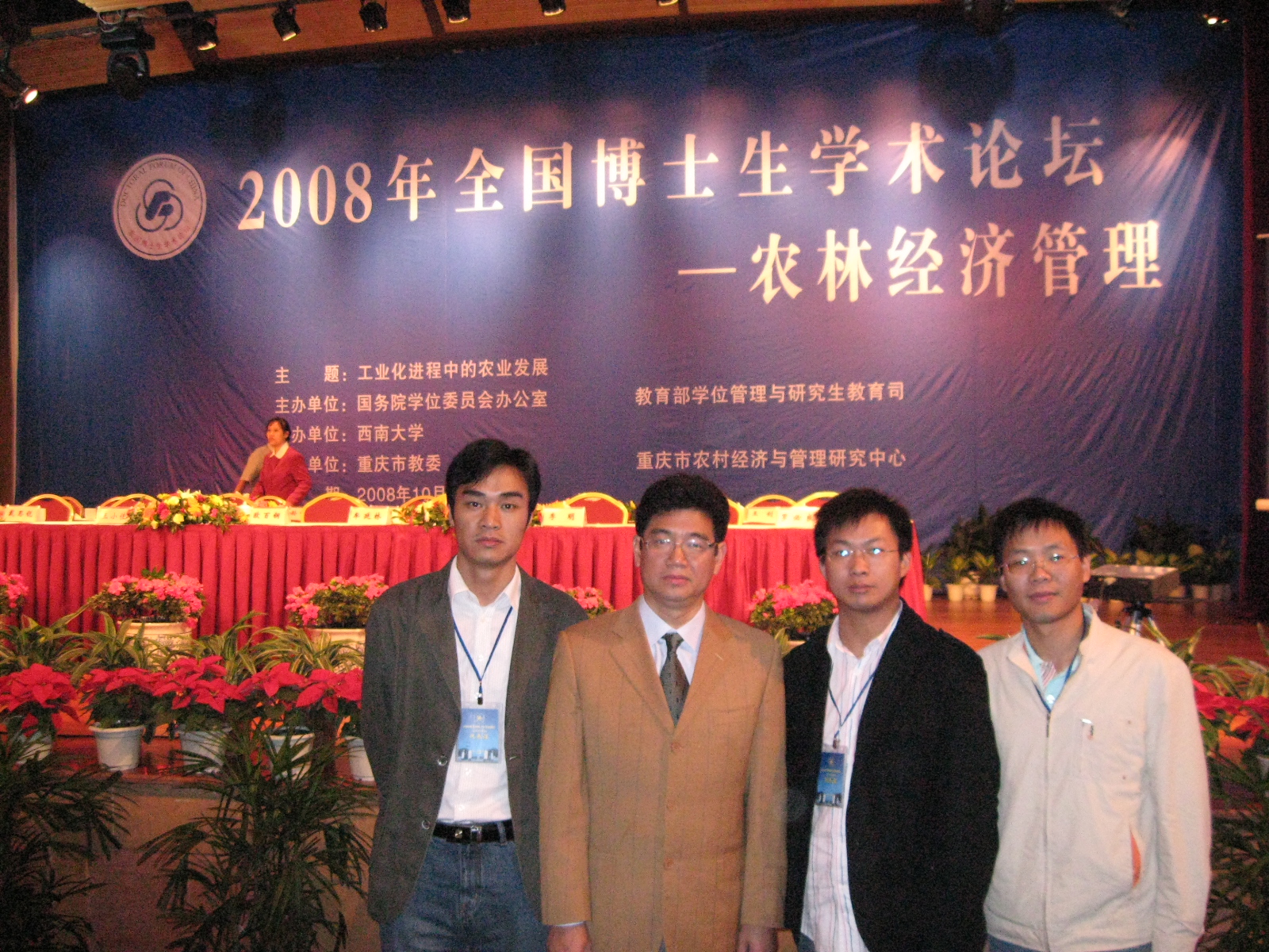由国务院学位委员会办公室和教育部学位管理与研究生教育司主办,西南大学承办的“2008年全国博士生学术论坛(农林经济管理)” 10月18日-10月21日在重庆西南大学召开,英国365官网钟甫宁教授、周应恒院长和纪月清、张晖、张龙耀三名博士生参加会议。本次论坛的宗旨是: 荟萃精英、思想碰撞、力求创新、互助共进 ,主题是工业化进程中的农业发展。论坛共设10个议题,包括农业功能及基础地位、农地制度探索与创新、农民组织和农业生产组织化、农产品价格运行与调控、农村公共产品供给与管理、农民就业行为及引导、农业技术创新与农业现代化、农业资源环境利用与保护、农业补贴与农民利益保护、农业发展中的金融服务问题等。