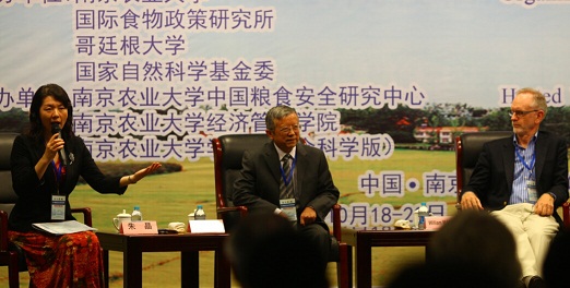 10月20日下午,备受瞩目的“与大师面对面”活动于2014粮食安全与农村发展国际学术研讨会闭幕式前举行。15:45分,大家翘首期待的国际农经学会主席、世界银行农业与农村发展研究部主任(William Martin),德国哥廷根大学教授(Stephan v. Cramon-Taubadel),美国普渡大学教授、美国农经学会执委(Holly Wang),英国正版365官方网站中国粮食安全研究中心主任、国务院学位委员会农林经济管理学科评议组召集人、南农大经管学院教授钟甫宁走上主席台,现场响起热烈掌声。南农大英国正版365官方网站院长朱晶教授主持该活动。该活动全程用英语交流,现场气氛非常热烈。