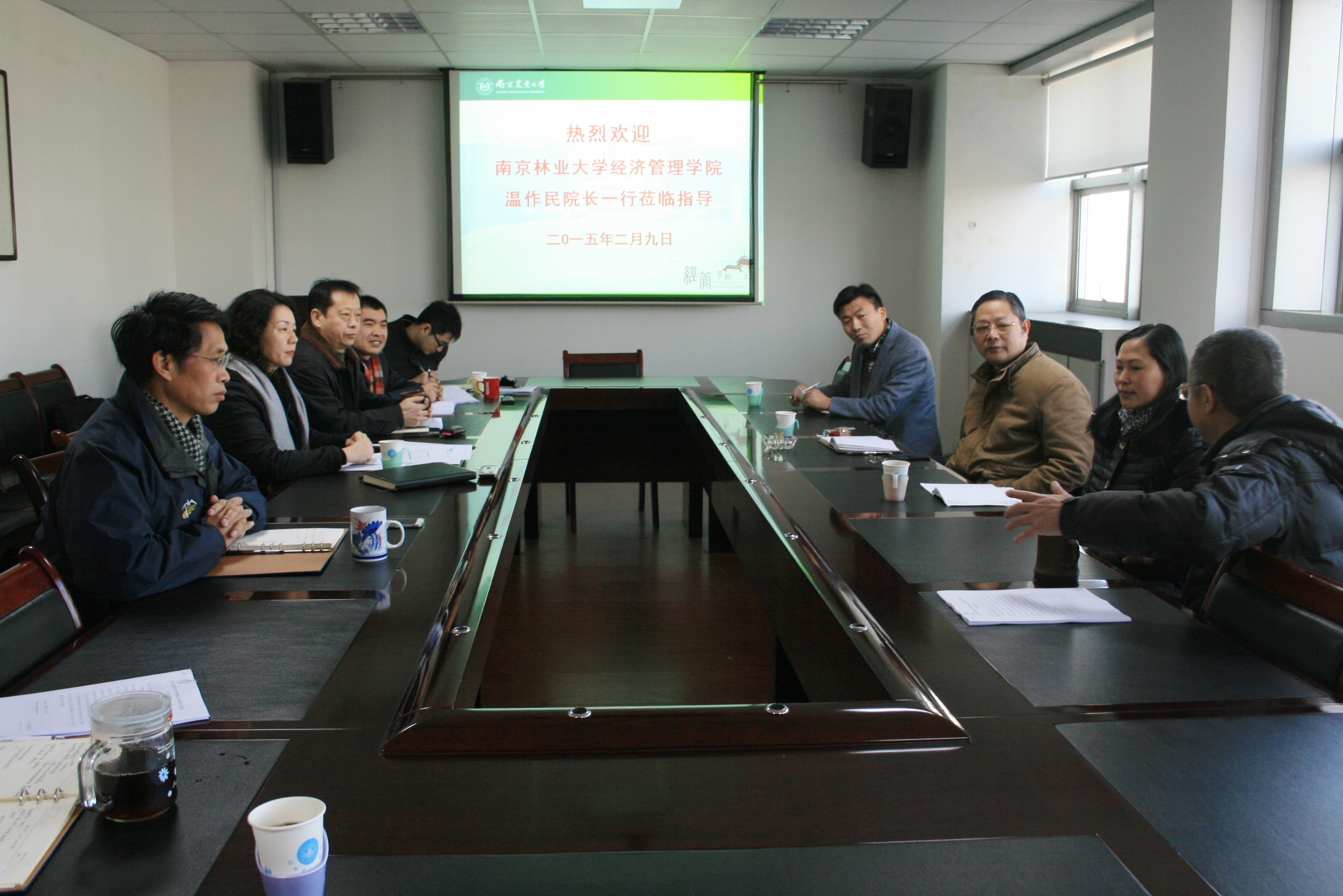 2015年2月9日,南京林业大学英国正版365官方网站院长温作民、党委书记高晓琴、副书记刘子超等一行来英国365官网交流学科建设事宜。英国365官网党政领导班子、钟甫宁教授、孙顶强副教授等参加了交流会。