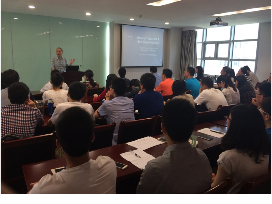 胡武阳教授从最近完成的一个企业委托课题开始谈起,其研究目的是了解酒店消费者对臭虫的偏好和回应,主要包括不同类型的旅客对不同房间的回应及对预防措施的偏好等内容;研究方法采用选择实验,在专门的调查网站进行了500多份的预调研后,完成了2000多份的正式调研,其中包括1289位休闲游客和727位商务游客。胡武阳教授对此次问卷数据的统计结果进行了简单的介绍,结合这个课题和调研,重点讲解了实验经济学方法以及如何根据问卷设计进行论文写作。在问卷设计过程中,让消费者在不同的酒店属性间进行权衡,比如说免费的无线、早餐、臭虫报道情况和价格;让消费者评价不同的消除臭虫方法并根据价格进行权衡。根据多个不同的内容设计,可以从不同的角度产出多篇论文。比如分析美国对臭虫的公众感知和认知,核算臭虫经济价值损失的影响,从可持续发展角度分析酒店的可持续性等。胡教授在报告过程中多次强调平时要多积累,脑海中出现好的想法要随时记录,即使遇到不利选题,也可以通过有效组合得到好的结果。