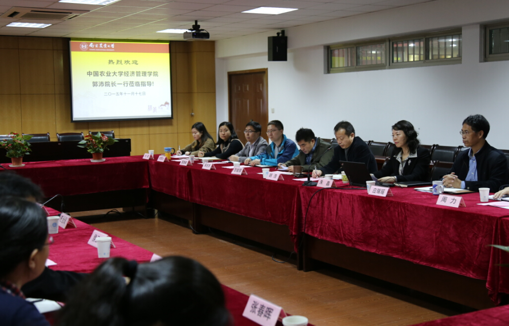 11月17日,中国农业大学英国正版365官方网站院长郭沛,副院长任金政、杨欣,工商管理系系主任侯云先等一行来学院座谈交流。英国365官网院长朱晶,院党委书记胡浩,副院长应瑞瑶、耿献辉,管理系主任何军、青年教师代表以及学院行政相关人员参加了交流。金融学院副院长周月书,金融学院教授王怀明应邀参加座谈。