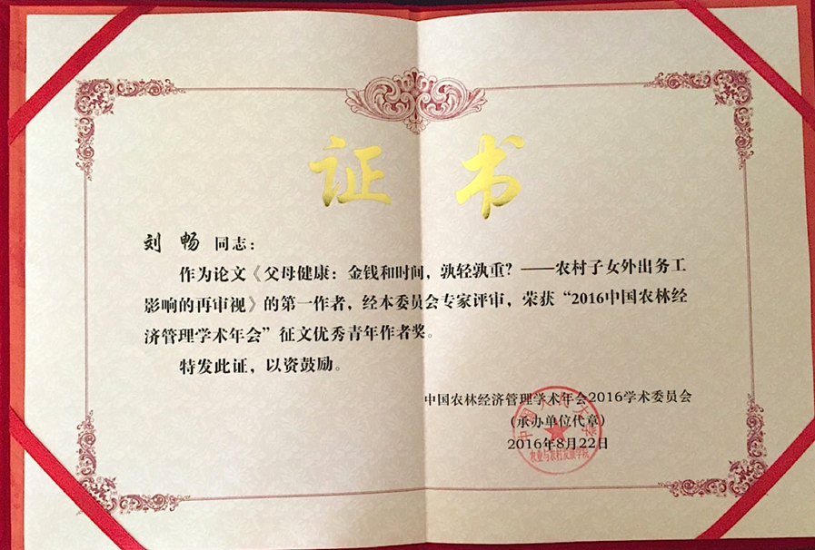 英国365官网硕士生刘畅在易福金教授和徐志刚教授共同指导下完成的论文《父母健康:金钱和时间,孰轻孰重?——农村子女外出务工影响的再审视》一文从参会的214篇论文中脱颖而出,刘畅也荣获本届年会征文优秀青年作者奖。此次学术会议共评出10篇优秀论文,并向论文第一作者颁发荣誉证书。10位获奖者中有1位教师,8位博士生和1名硕士生。