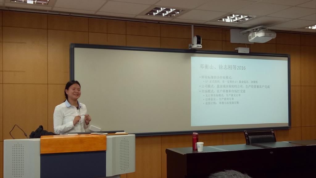 紧接着,他开始讲解合作社国内外研究情况,他表示,国内合作社研究鲜有从理论上对不同组织模式的综合对比分析,而国外关于合作社的研究虽有一个比较的综合分析框架,却不能直接应用于我国的实际问题分析中。因此,他想对不同的合作组织模式进行对比分析并揭示组织在质量控制及提高农民收入两个维度的联动功能。
