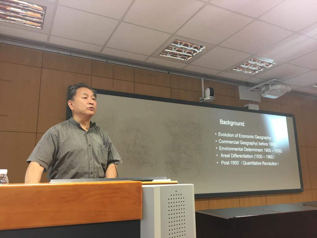 刘建一教授先介绍经济地理学的背景、土地利用与城市发展的关系。他首先介绍了自己,出生于贵阳。研究人类地理、乡村地理及经济地理。他说道经济地理关心的还是经济问题,是很古老的学科,在15世纪就开始发展,早期被称为商业地理,主要考虑每个国家有何种资源及物产及如何利用他们为人类谋福利。1900年到1930年期间,社会科学都被一种环境制约的哲学掌控,人们过于迷信环境的力量。1930-1960年,开始关注区域差异,不同区域有着文明不同分布,其经济发展状况人文社会也大不相同。1950年之后开始大量的变革,非常强调计量经济学的研究,信息发展也加快了学科研究。对于经济地理来说,主题是有两个,一是地质,二是地理。地质研究地下,地理分为两种,一是自然地理,研究气候、人文地理、研究人如何利用自然环境。首先知道区位,其次知道地区的个性特点,第三是不同人环境资源形成的环境区域,比如长三角与东北三省就有明显的地理差距。 第四是关注人类活动、人口迁移,强调空间统计。经济地理与其他学科联系紧密。