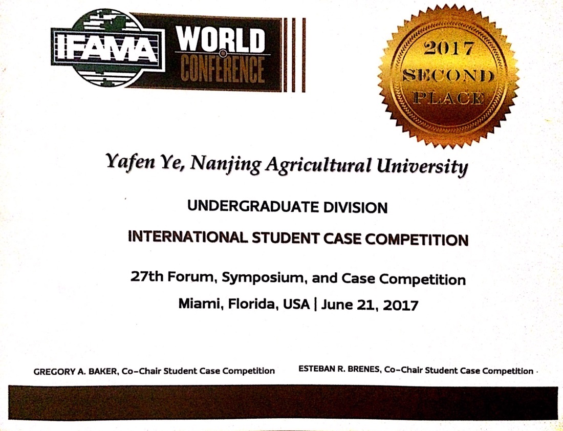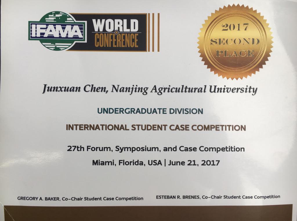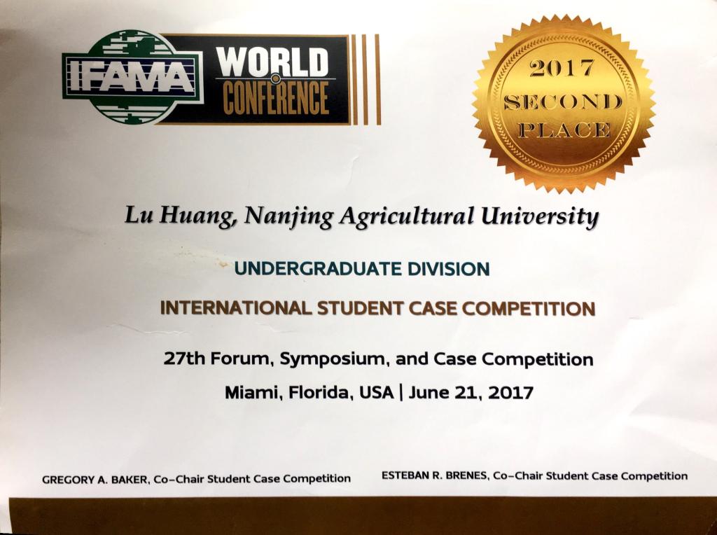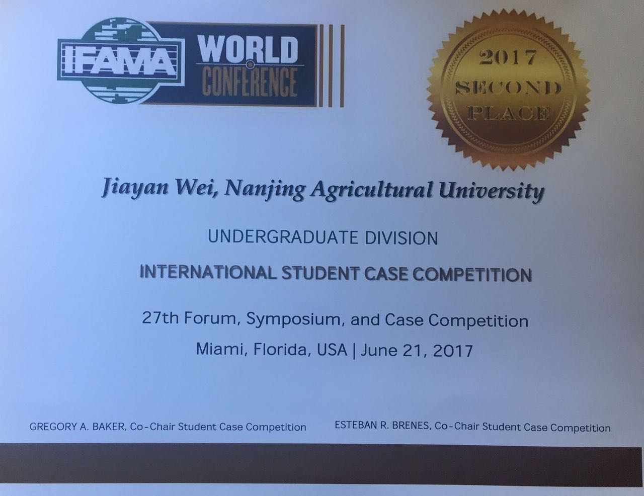 国际食品与农业企业管理协会(International Food and Agribusiness Association,简称IFAMA)第27届年度论坛与研讨会于6月18日至21日在美国迈阿密举行。英国正版365官方网站英国正版365官方网站继连续三次取得佳绩后,在今年的案例竞赛中,由学院蔡忠州教授、朱战国副教授培训并指导的韦佳彦、黄鹭、叶娅芬、陈俊璇等四位本科生组成的代表队赴美参加2017IFAMA国际学生案例竞赛,与25个世界名校参赛队伍同场竞技,再传捷报,荣获本科生组亚军。
