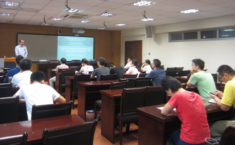 9月11日上午,巴西南里奥格兰德联邦大学Antonio Domingos Padula教授来英国365官网作题为《The Impact of Chinese imports of soybean on port infrastructure in Brazil: a study based on the concept of the "Bullwhip Effect"》的报告,报告由周曙东教授主持。耿献辉教授和部分青年教师、研究生参加了报告会。