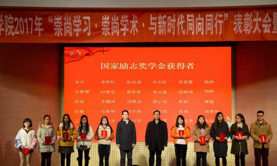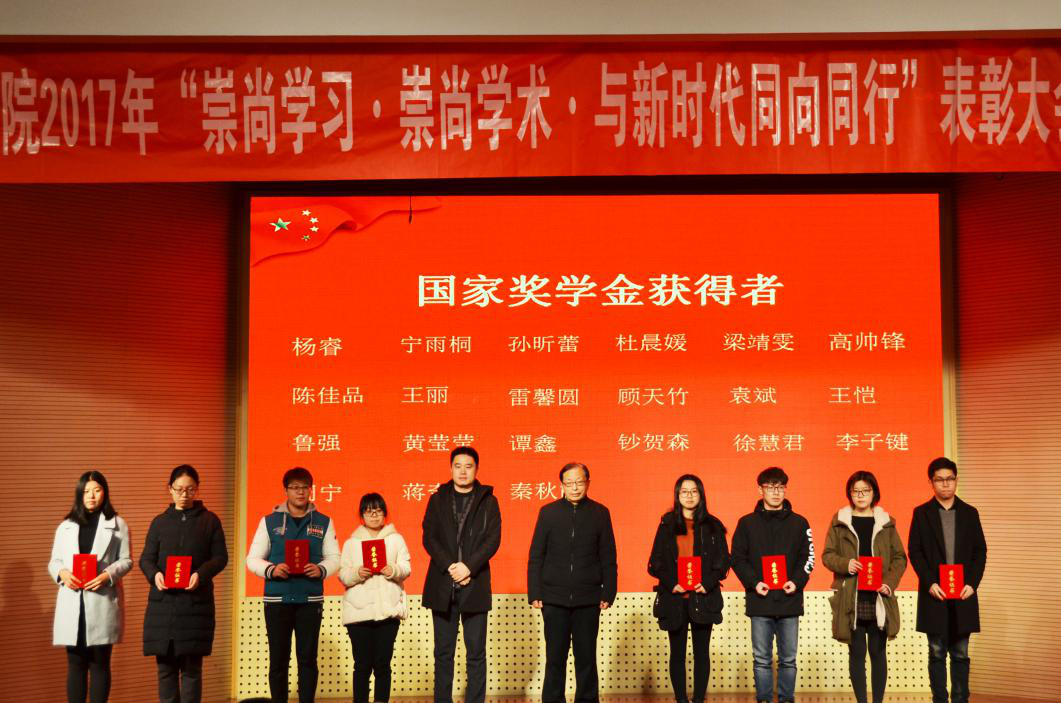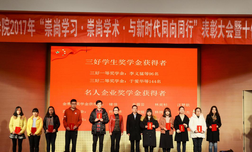 “崇尚学习崇尚学术 与新时代同向同行”表彰大会总结了英国正版365官方网站2017年的育人成果,并由出席大会的领导作为颁奖嘉宾分别为优秀干部获得者、刘崧生奖学金获得者、名人企业奖学金获得者、三好学生奖学金获得者、国家励志奖学金获得者和国家奖学金获得者代表颁奖。