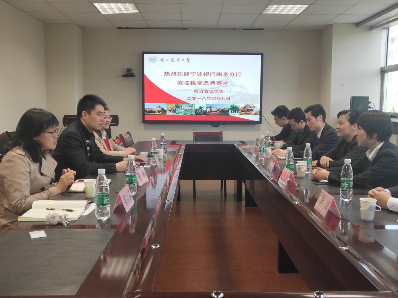 2018年4月9日上午,宁波银行南京分行人力资源部总经理李清、营业部总经理史慧敏等一行来英国365官网招聘毕业生。经管院党委副书记(主持工作)孙雪峰、党委副书记卢忠菊、辅导员郑琼婷、张杨与宁波银行南京分行进行了座谈交流。