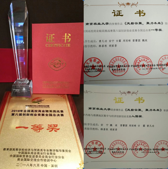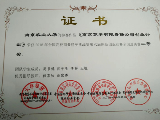 6月8日-10日,2018年全国高校商业精英挑战赛第六届创新创业竞赛在广东省深圳市成功举办。本次竞赛是由教育部高等学校经济与贸易类专业教学指导委员会、中国国际商会商业行业商会、中国国际贸易促进委员会商业行业分会、(国资委)商业国际交流合作培训中心,中国国际贸易促进委员会商业行业分会、(国资委)商业国际交流合作培训中心承办。英国365官网教师韩喜秋和胡家香带领来自农林经济管理、国际经济与贸易和工商管理等专业的本科学生共计8人参加此次比赛,经过激烈角逐,创业组项目《风船云聚,聚力未来》从12组队伍中脱颖而出,斩获总决赛金奖,获得一万五千元奖金,同时取得代表内地参加2018年10月在香港举办的“内地与港澳地区数字与经济创新创业竞赛”的参赛资格。另外,本院提交的参赛方案《南京苏伞有限责任公司创业计划》获创客组全国二等奖。