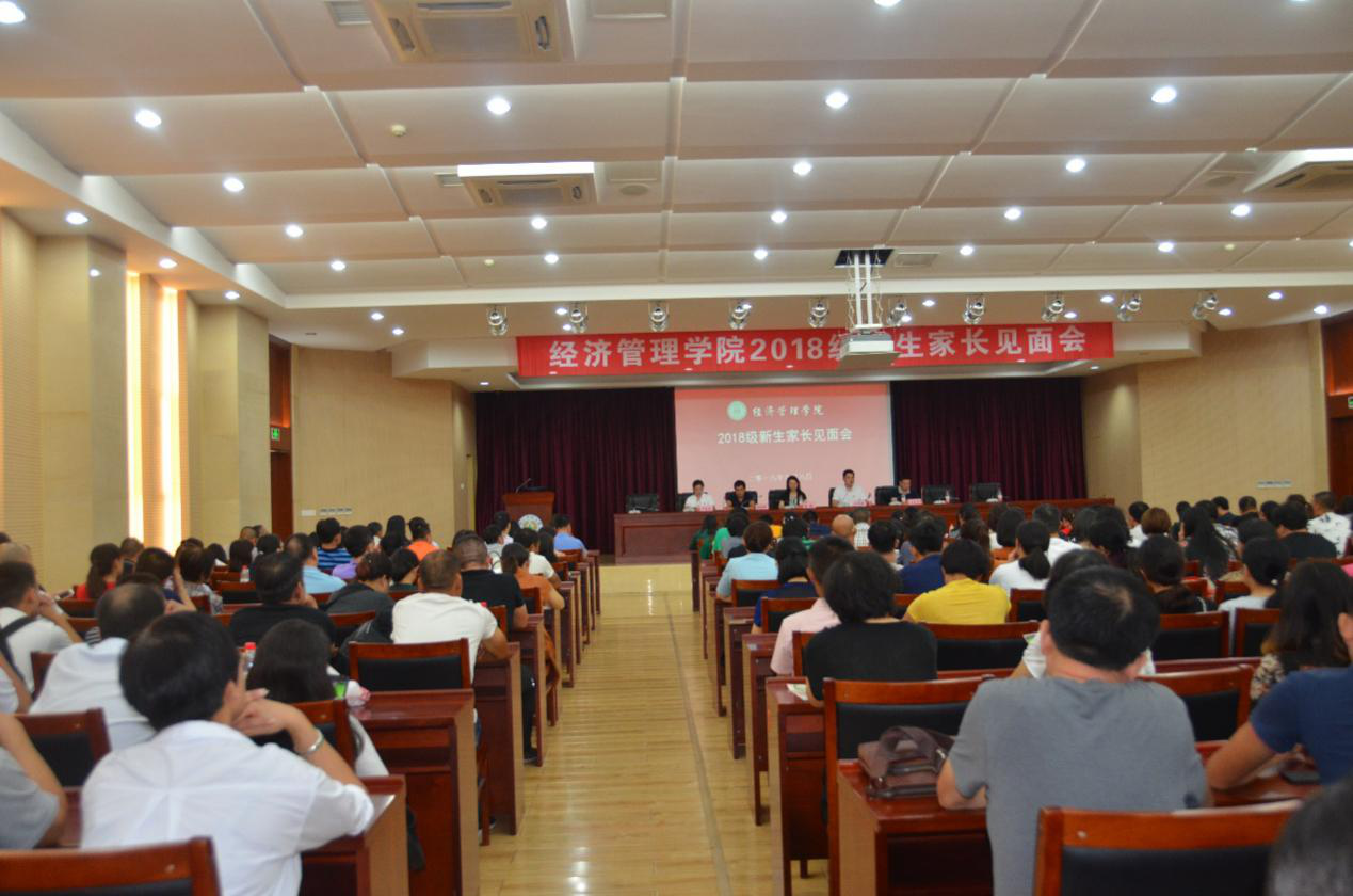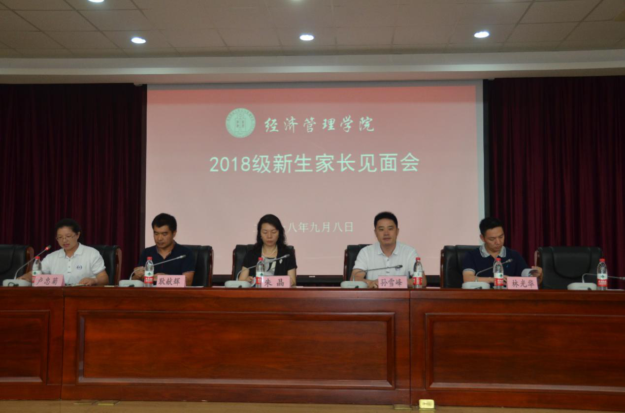 2018年9月8日下午3:00,经管院2018级新生家长见面会在金陵研究院三楼报告厅举行。英国正版365官方网站院长朱晶教授、院党委副书记(主持工作)孙雪峰、副院长耿献辉、副院长林光华、院党委副书记卢忠菊以及各系系主任、各新生班主任老师、本科生辅导员出席会议。会议由院党委副书记卢忠菊主持。