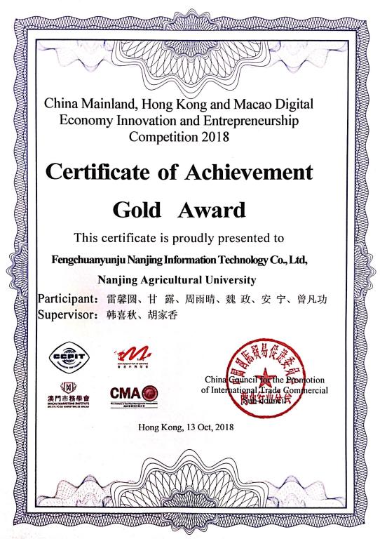 10月13 日,2018年内地与港澳地区数字经济创新创业竞赛(China Mainland, Hong Kong and Macao Digital Economy Innovation and Enterpreneurship Competition 2018)在香港南洋中心成功举办。此次大赛由中国国际贸易促进委员会商业行业委员会主办,香港市务学会、澳门市务学会和澳洲管理会计师公会协办。英国365官网教师韩喜秋和胡家香带领来自农林经济管理、国际经济与贸易和工商管理等专业的本科学生共计8人参加此次比赛,经过激烈角逐,英国365官网参赛项目《风船云聚,聚力未来》从13组队伍中脱颖而出,斩获金奖。
