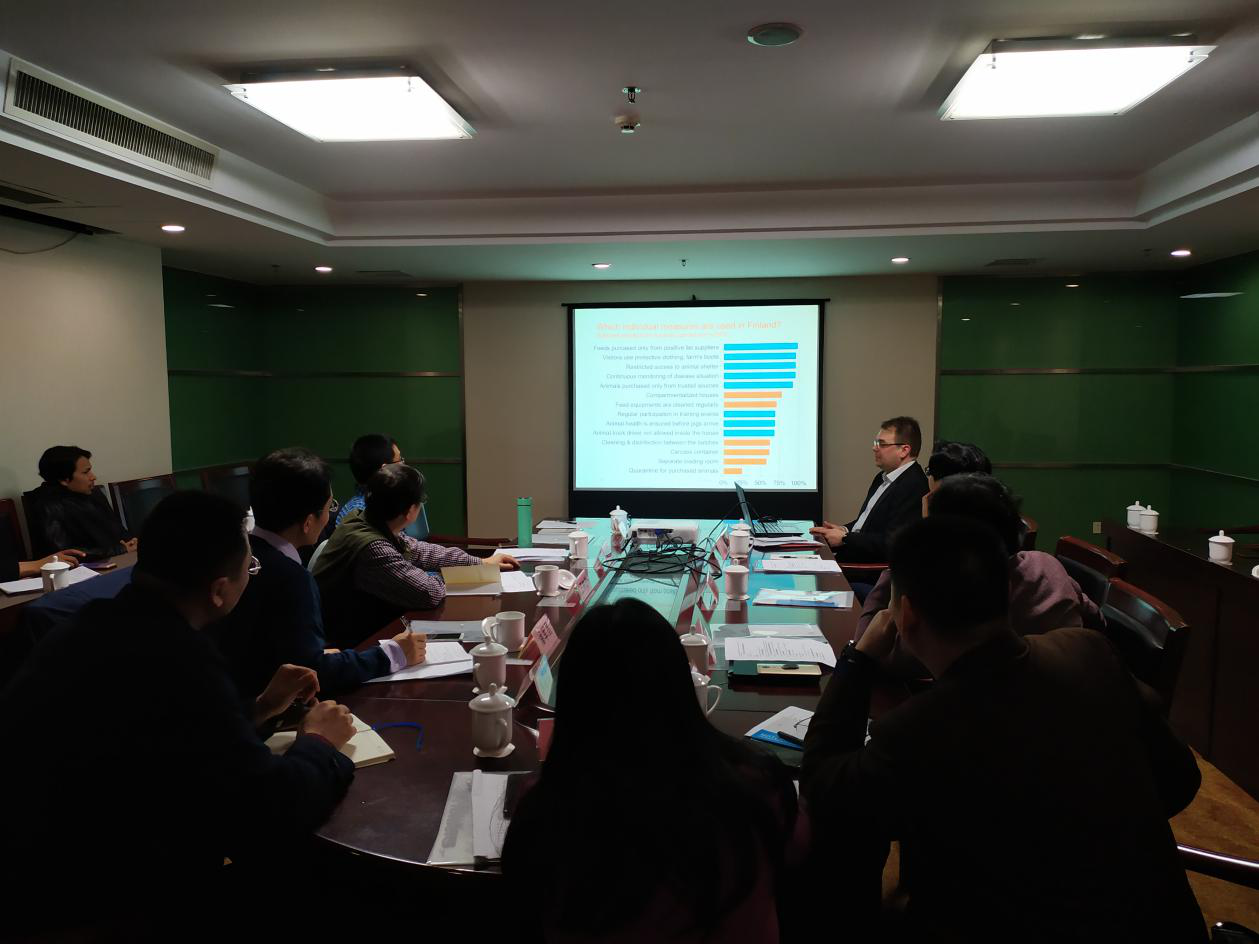 随后,四位校外专家就各自研究内容分别进行了专题报告。Jarkko Niemi教授就“Meeting consumer expectations: Traceability, biosecurity and preventive health management in Finnish pig farming(与消费者期望结合:可追溯、生物安全和预防性动物健康在芬兰生猪养殖的实践)”进行了报告、范欣科长就“进出口食品安全监管”进行了报告、张永青处长就“南京农产品质量安全管理的实践”进行了报告、孙薇主任就“南京众彩物流中心检测公司农副产品物流配送中心食品安全的管理经验”进行了报告。