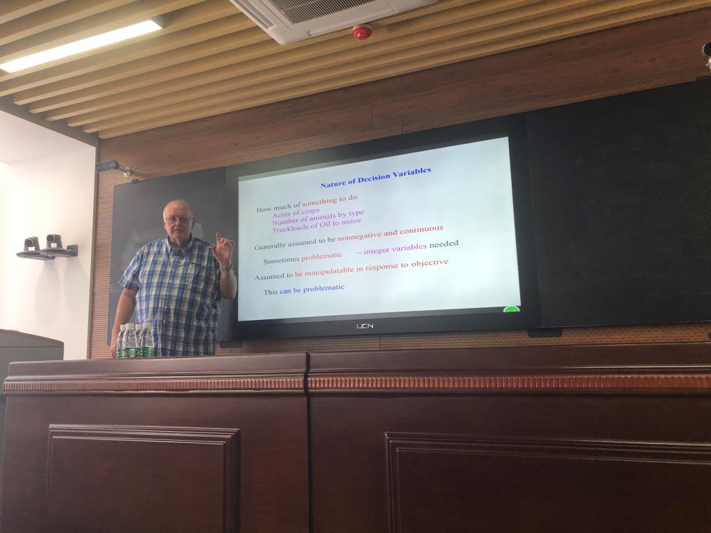Bruce A. McCarl教授首先提出问题:我们为什么要建模?教授指出,作为经济学家,我们通常会解决我们需要预测行为的问题。我们在一个框架中解决这些问题试图了解市场行为并可能制定利用该行为的策略或者评估/建议政策,以产生更有益的结果或尽量减少有害的结果。紧接着,Bruce A. McCarl教授向我们阐释了如何能够做到这一点。通过利用计量经济学,对建立的假设予以收集数据,建立模型,在这样的情况下解决模型,并比较结果以预测未来。随后,Bruce A. McCarl教授介绍了方法的特点,优化如果使用正确的变量,约束和目标定义模型,则可以正常工作。需要截面数据,需要很好地描述资源权衡和生产可能性。教授随即介绍了基本优化问题、决策变量的性质、目标函数的性质。并通过一个公司希望开发牛饲养方案进行案例应用,介绍了数学规划通常被认为是开发决策变量最优值的方法,还有相当多的其他潜在用途。同时也指出要有问题洞察力、数值数学规划、线性规划问题及其要素、线性规划问题解决方案的要素及其应用:Joe的衬衫、衬衫店。在接下来的时间里,Bruce A. McCarl教授介绍了运输模型和制定运输问题及其案例、气候变化对作物生产模式气候引起的运输流量和内陆水道的影响,通过讲述一个完整的论证过程让大家真切的看到研究的整个过程,让在会的人员更加深刻的相关的研究方法。