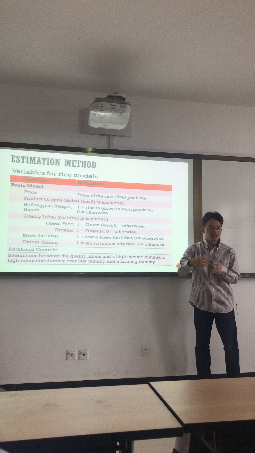 Satoru Shimokawa教授指出,食品安全是食品质量的重要维度,而食品标签是消费者识别食品安全的主要途径。在中国,居民对高质量食品的需求不断增加,但城乡居民对食品标签的认识存在很大差异。因此,Satoru Shimokawa教授在湖北省城乡展开调研,研究绿色食品标签在解释我国城乡居民食品质量需求差距中所起的作用。Shimokawa教授详细介绍了调研设计、问卷内容以及样本采集过程,并对计量估计模型以及实证结果进行详细讲解。最后,Satoru Shimokawa教授总结了该研究的主要结论:食品质量标签的边际支付意愿存在显著的城乡差距,这种差距主要源自于城乡居民对标签知识的认知差异,而收入以及其他因素的影响较小。Shimokawa教授同时指出,虽然绿色食品在中国已经发展了多年,但研究发现,即使在武汉这样的省会城市,市场中销售的绿色食品也很少,而且很多农村消费者从未见过绿色食品。