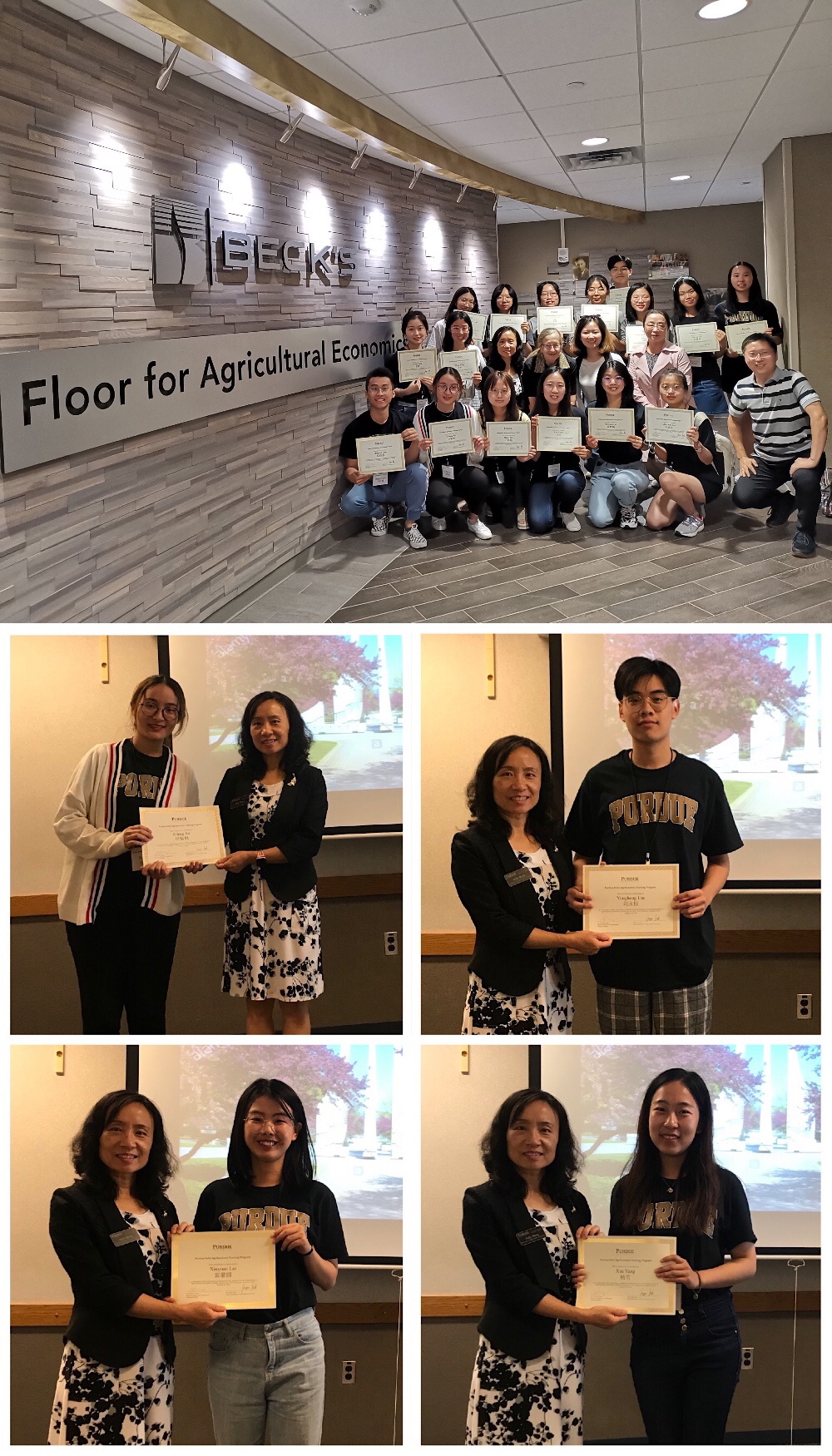 在此次交流活动结业典礼上,英国365官网学生积极发言分享本次访学感悟,普渡大学项目主任Holly Wang教授对英国365官网学生的表现给予高度评价,希望今后能与英国365官网继续开展此类项目,并拓展双方在人才培养、师资培训、科学研究等方面的合作,共同交流两国农业发展问题。展进涛教授及张梅老师代表访学团致辞,感谢普渡大学农经系对本次访学活动的大力支持与精心安排,感谢所有的授课老师和工作人员,尤其是Holly Wang教授为本次访学活动的顺利开展付出的巨大努力,让团队成员受益匪浅,希望双方能够持续开展此类交流活动,在人才培养和科学研究等方面进一步拓展合作空间。最后,Holly Wang教授为同学们一一颁发访学项目证书并合影留恋。
