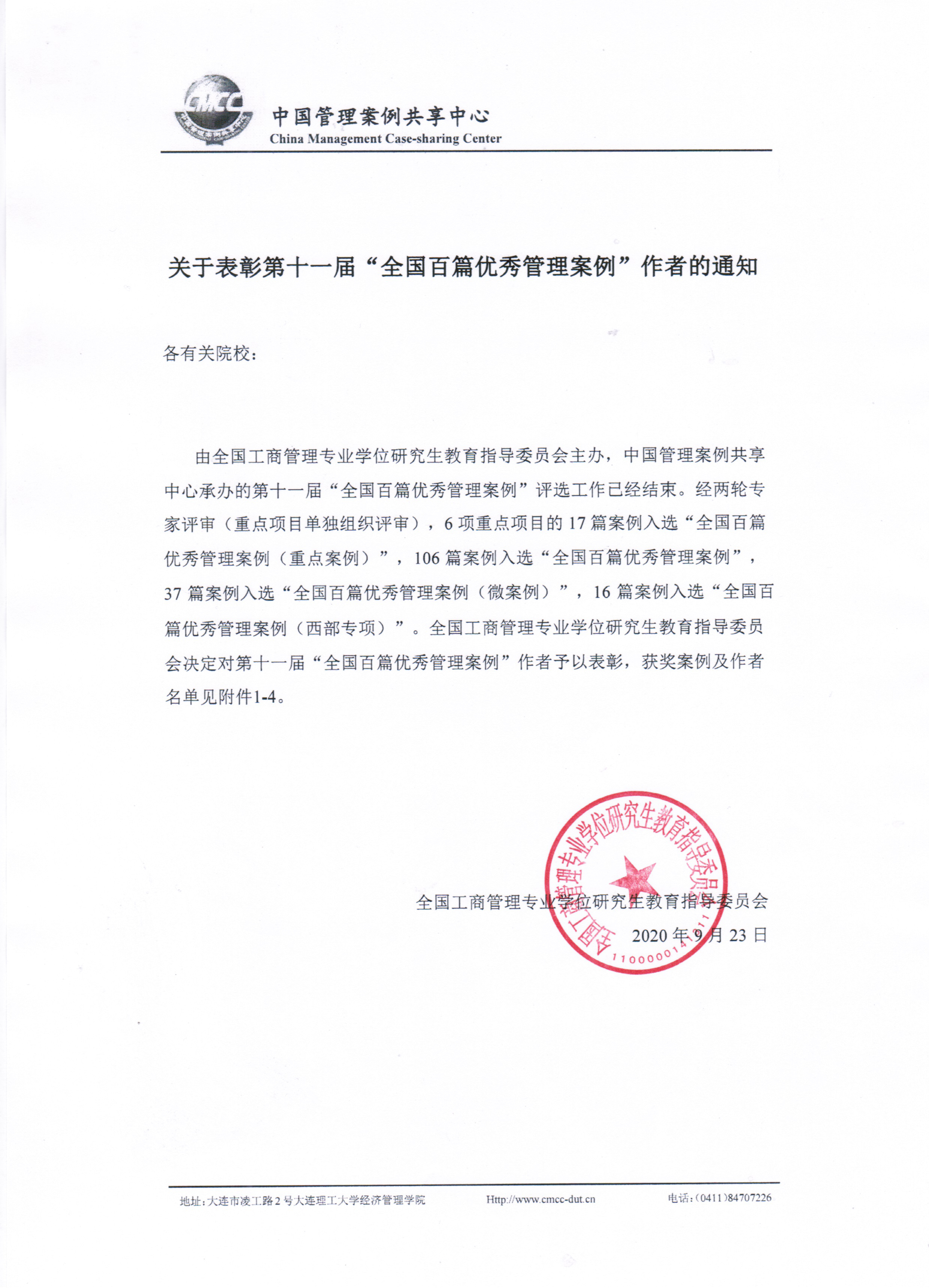 9月23日,由全国工商管理专业学位研究生教育指导委员会主办,中国管理案例共享中心承办的第十一届“全国百篇优秀管理案例”评选工作已经结束,英国365官网开发的MBA案例获评第十一届“全国百篇优秀管理案例” 。