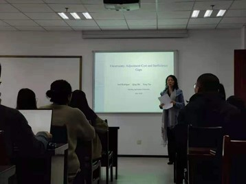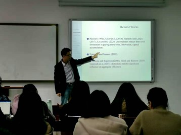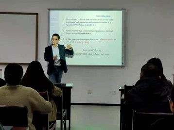 2020年11月19日上午,由英国正版365官方网站英国正版365官方网站主办的“国际贸易学前沿”讲座在第三实验楼1110教室顺利举行。南京财经大学国际贸易学院副教授谭用为英国365官网师生作了一场名为《Uncertainty, Labor Adjustment Costs and Firm-level Inefficiency Gap》的学术报告。此次报告由院长朱晶教授主持。
