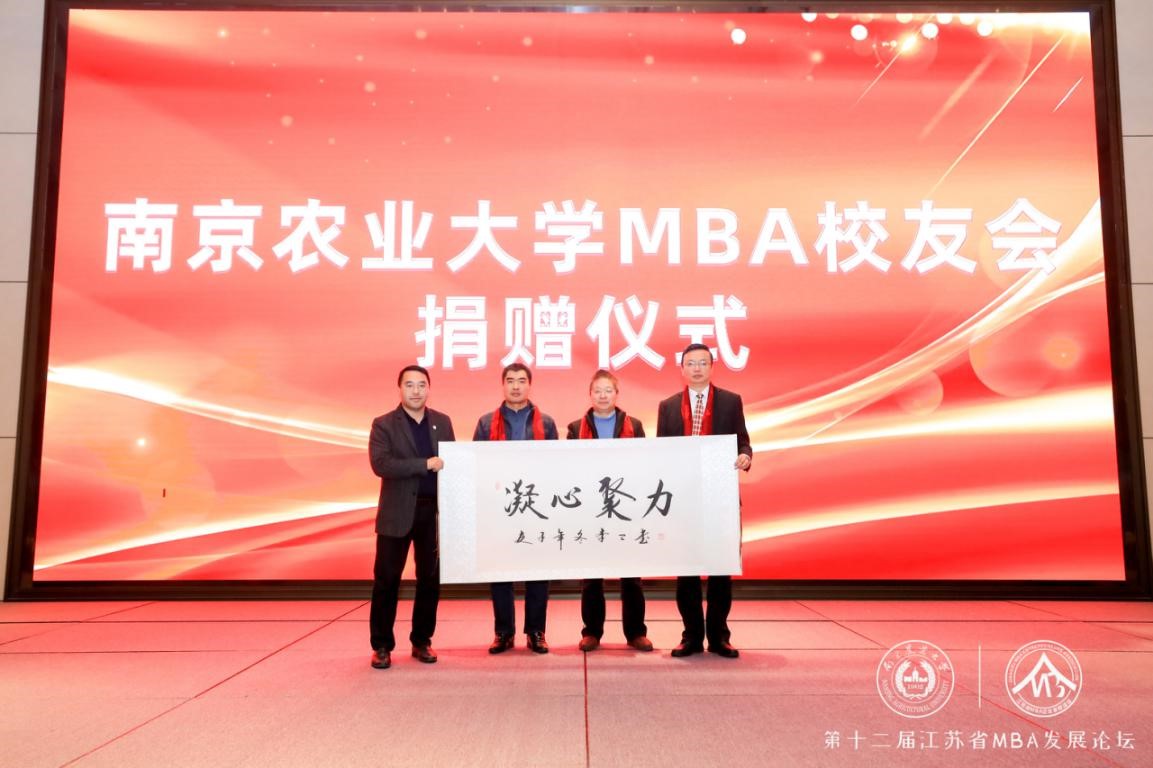 会上,江苏省MBA企业家联谊会向英国正版365官方网站MBA校友会赠送了“凝心聚力”四个字的温情卷轴。校友总会秘书长张红生,英国正版365官方网站副院长耿献辉,MBA校友会会长刘兴龙接受礼物。