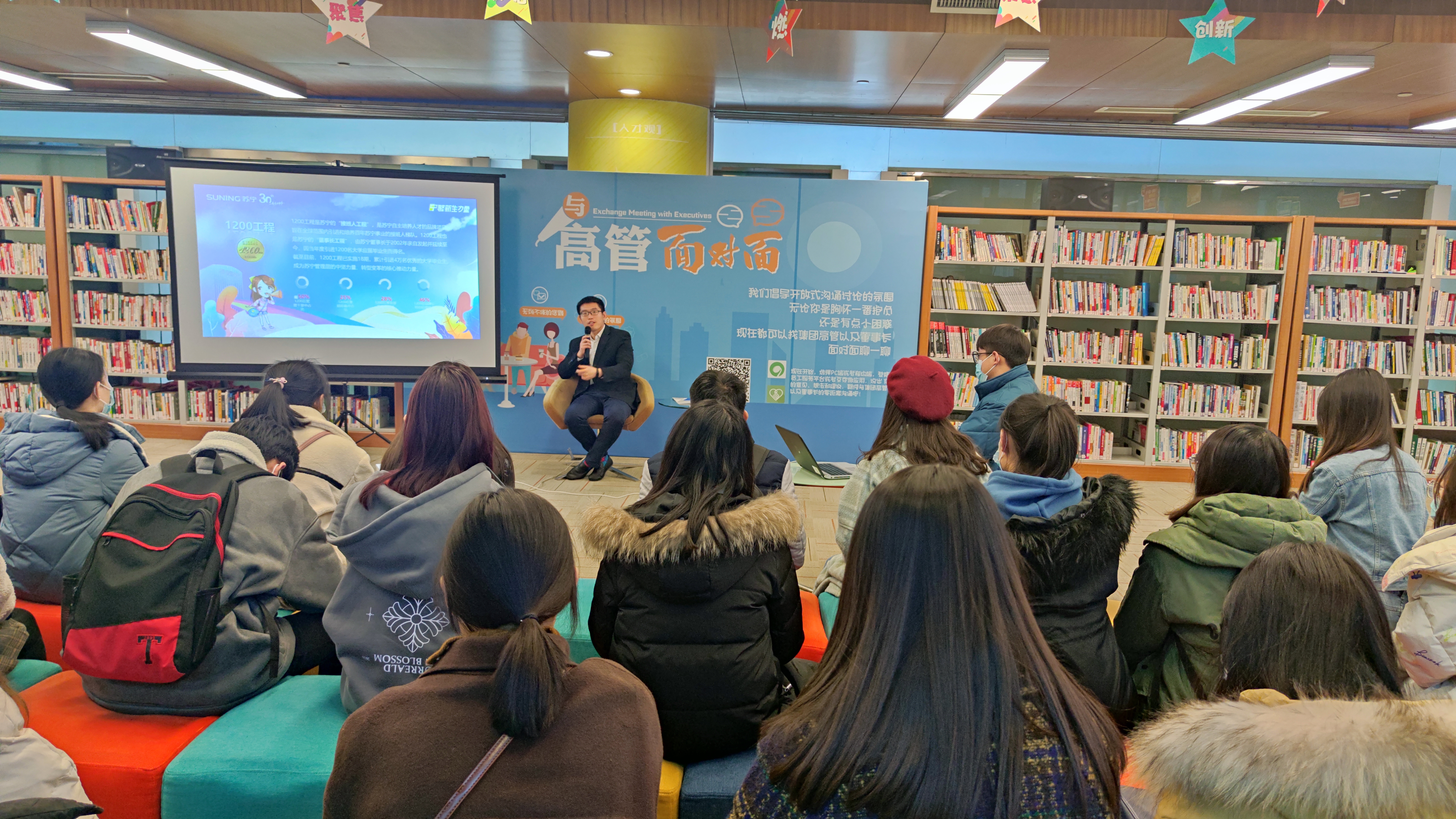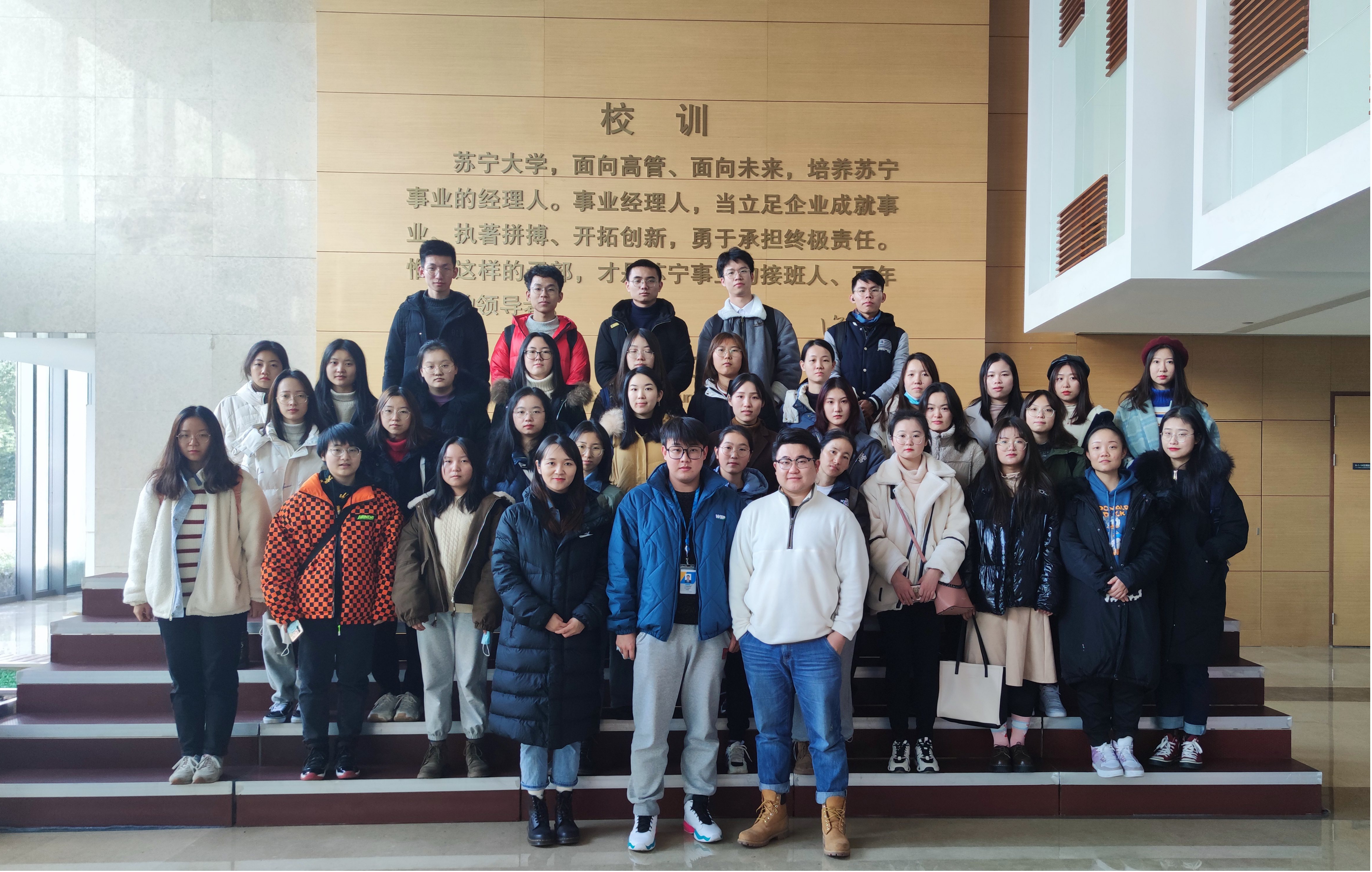 12月16日下午,英国正版365官方网站辅导员路行、梁雨桐及40名本研学生赴苏宁易购集团总部走访交流,集团人力资源管理总部招聘总监刘庆鹏、人力资源管理总部招聘部长赵春迪热情接待了英国365官网师生。