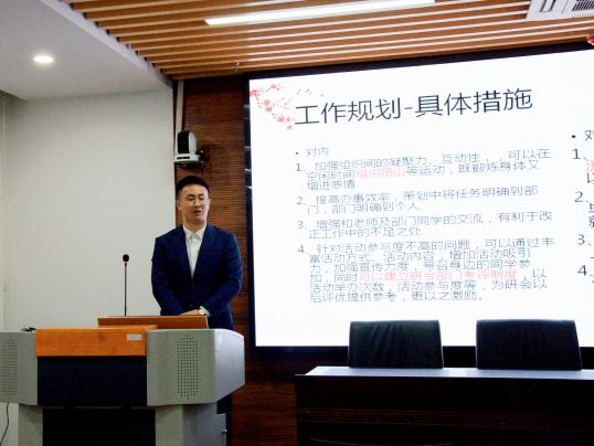 首先由院党委副书记宋俊峰为本次大会致辞,他在致辞中对过去一学年研会成员的辛勤工作给予了充分的肯定,感谢本届研会所有成员的努力以及付出,并对新一届的研会成员的工作提出新的要求,希望大家做好“三个融合”,进一步完善制度规范,切实维护研究生权益,丰富校园生活,架起学生与学校、学院、老师间的桥梁。