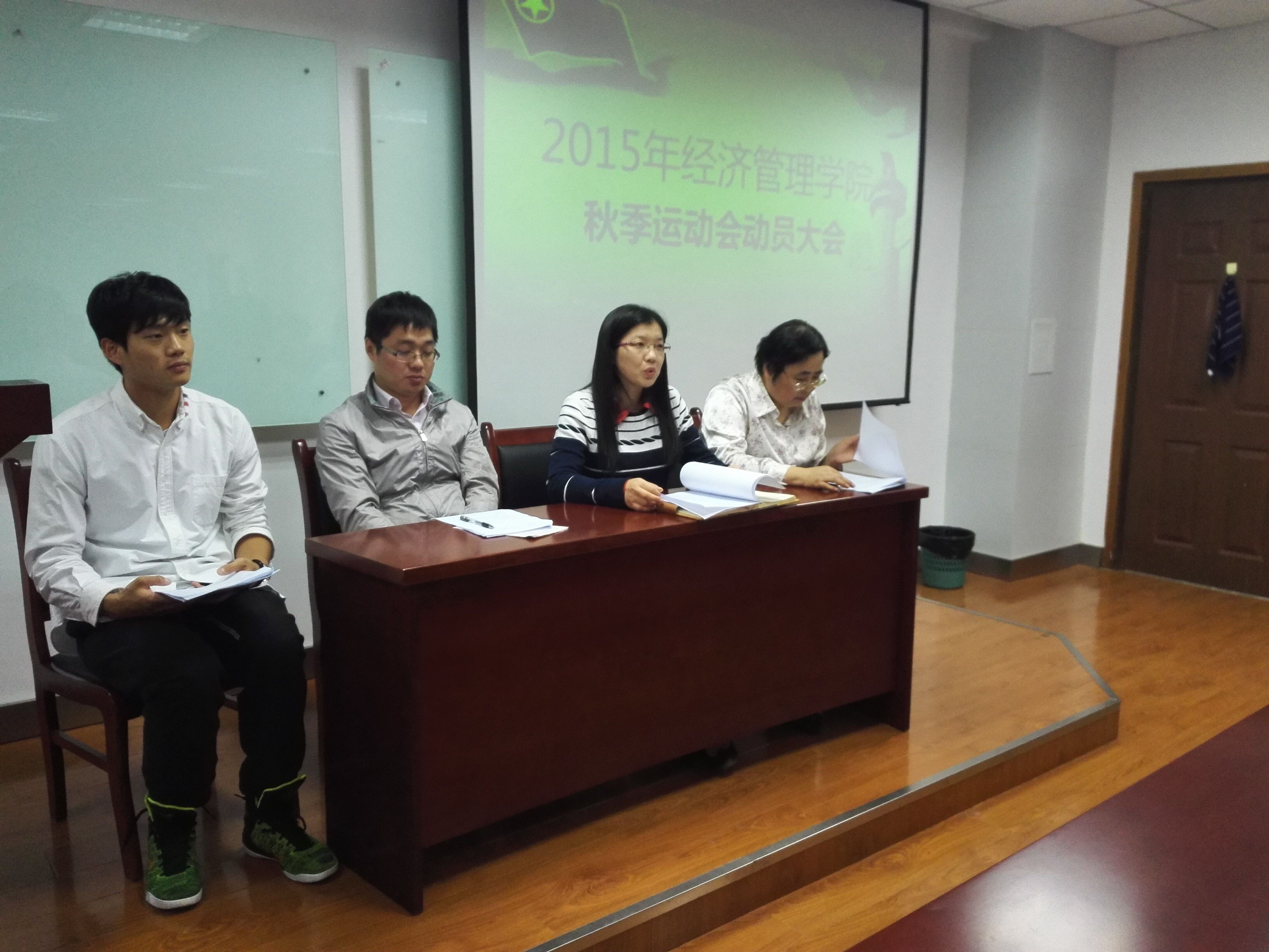 10月14日下午,英国365官网召开了2015年校田径运动会动员大会。学院党委副书记卢忠菊,辅导员施培菊、葛焱、谢涵,兼职辅导员于林功出席会议,全体参赛运动员参加了会议。会议由辅导员谢涵主持。