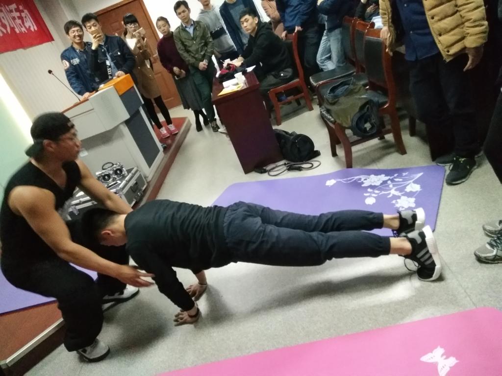 林枫老师先是进行了简单的自我介绍,用几段精彩的力量展示调动了现场的气氛。随后林老师讲解了人体各个部位肌肉组成,对各个肌肉群体的用途做了详细的说明。然后亲自示范了各个部位的肌肉应该怎样锻炼,主要针对二头肌、三头肌、胸肌、背阔肌、竖直肌等,中间还邀请同学们上台进行互动,现场气氛十分活跃,同学们参与的热情很高。