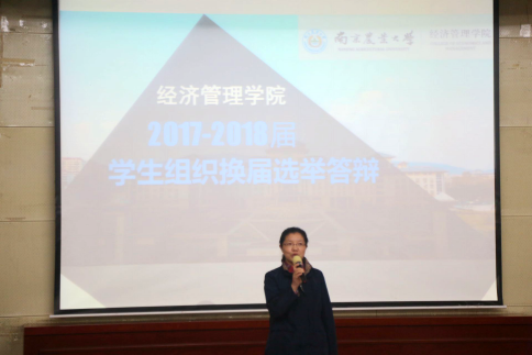 换届大会开始,竞选同学按照抽签顺序依次进行个人答辩,以幻灯片的形式分别从自我介绍、工作构想、未来展望等方面展开阐述。答辩结束后卢忠菊副书记讲话,她对上一届主席团成员的工作给予肯定,并对十七位竞选同学的现场表现予以赞扬。对下一阶段加强学生干部队伍建设谈了自己的思考和打算,勉励大家踏实奋进,为经管院更好的明天贡献力量。现场观众进行公开投票。