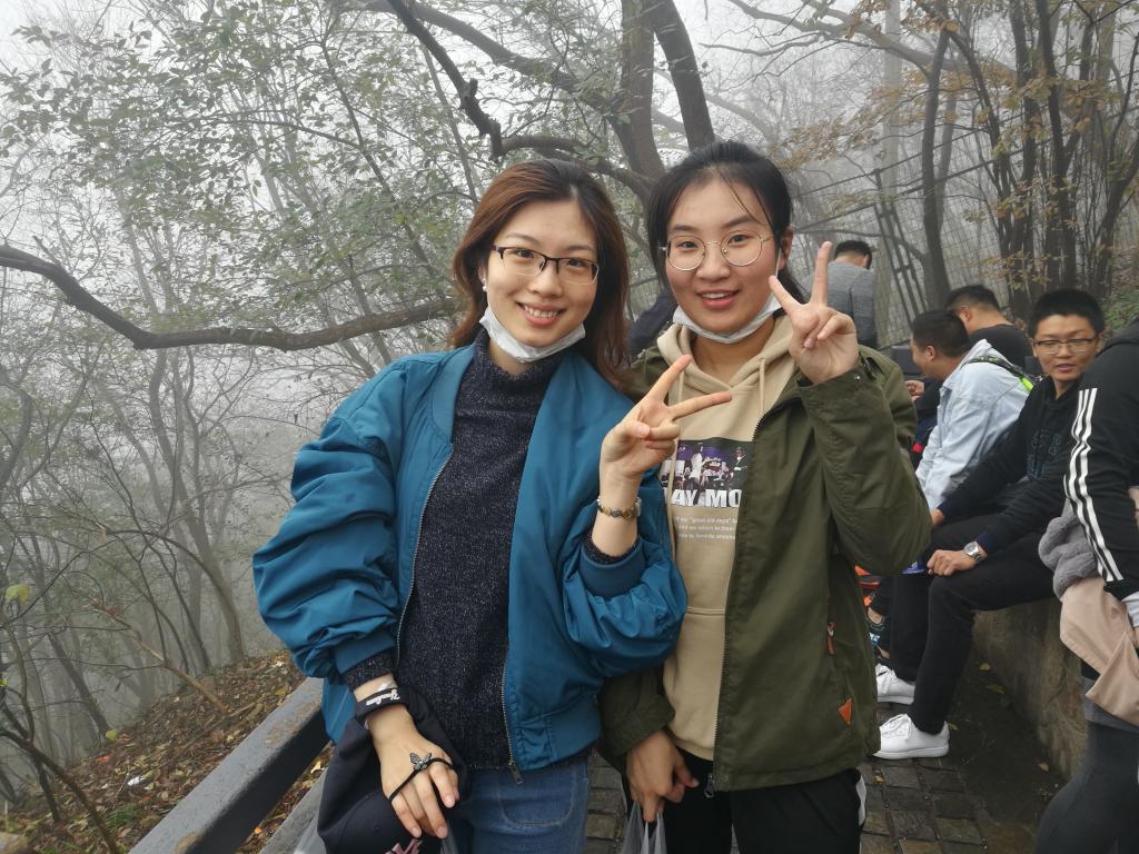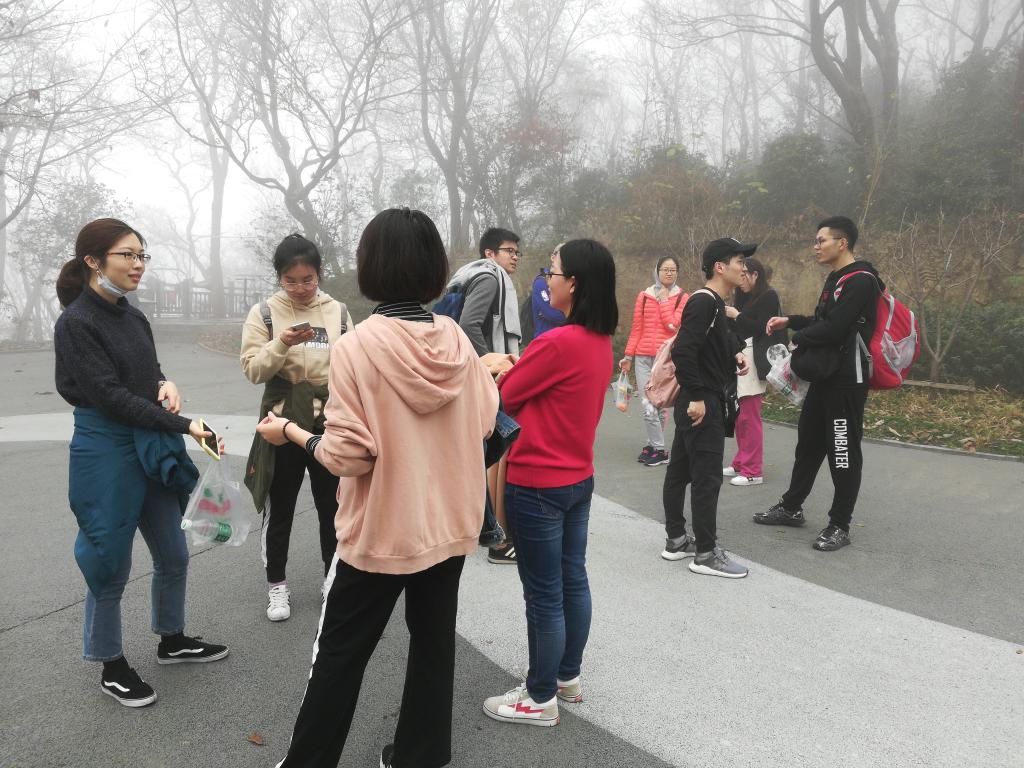 在登山过程中也发生了一些有趣的事情,由于今天的雾气十分重,所以我们戏称我们得道升仙了,每个人都有种腾云驾雾的感觉;半山腰的时候我们跟东南大学研二的学生相互拍照留念,最后我们又在山顶相遇;在路上听着别人说登山辛苦,要把所有密码告诉舍友的调侃;看着六七十岁老爷爷光着上身上山下山;虽然有一个同学因为没吃早饭而不舒服,但是最后还是在调整补给之后登上了山顶。