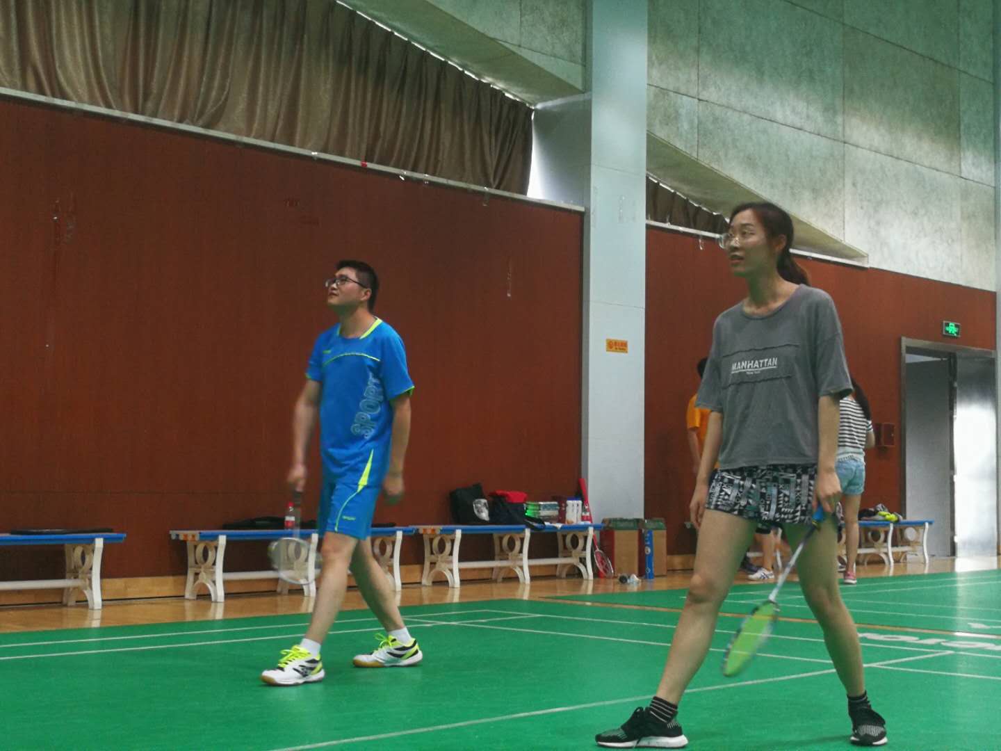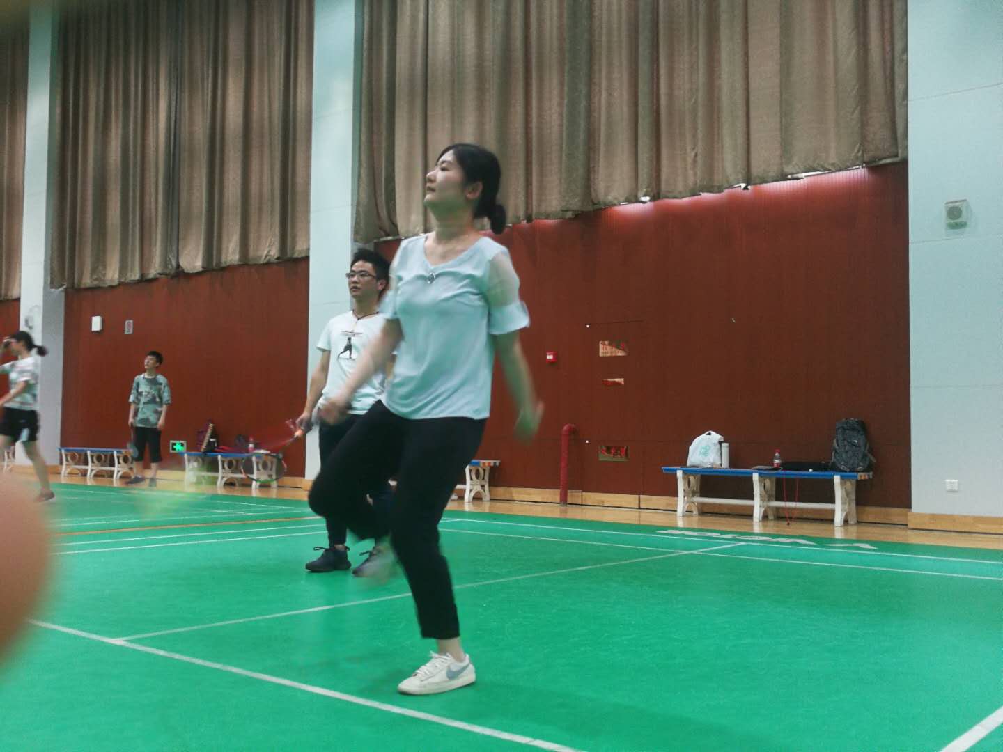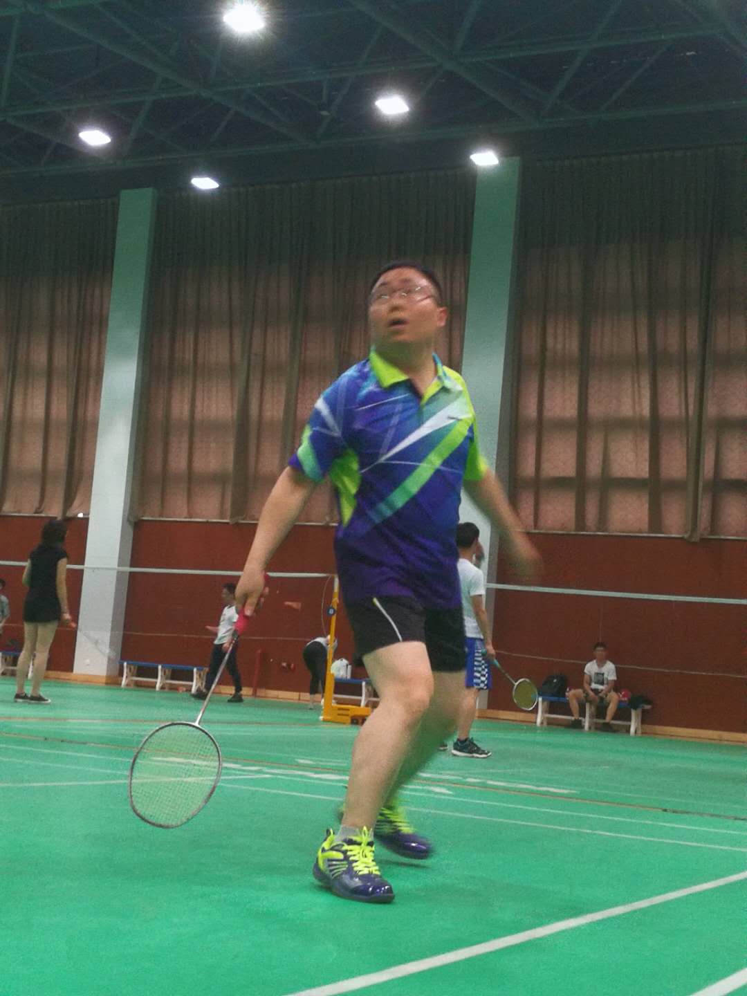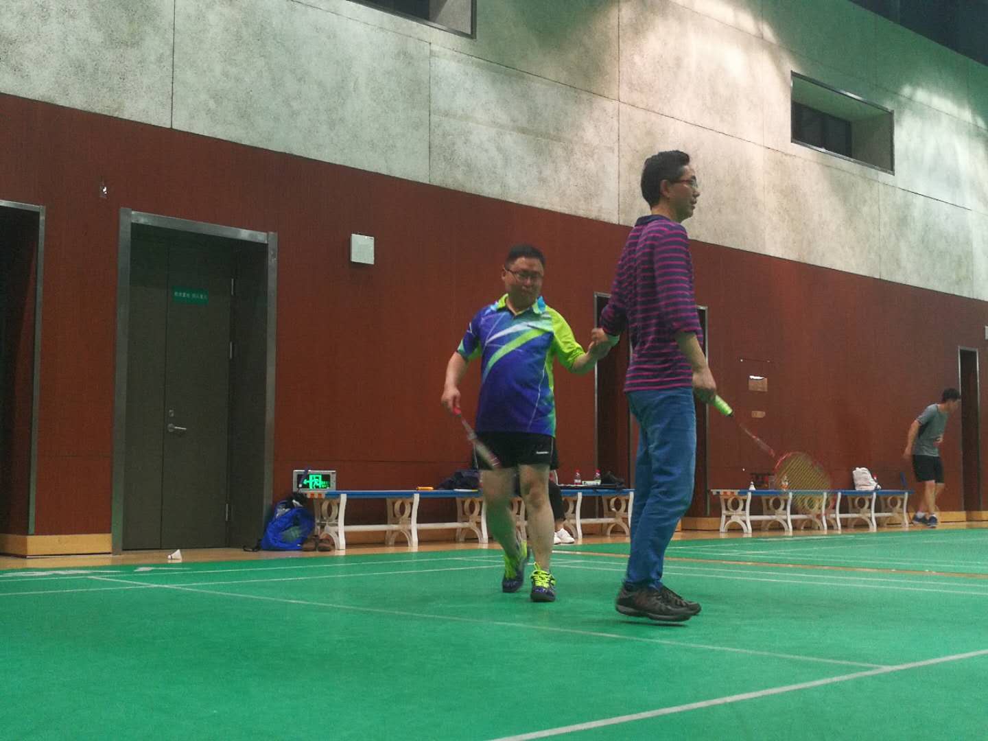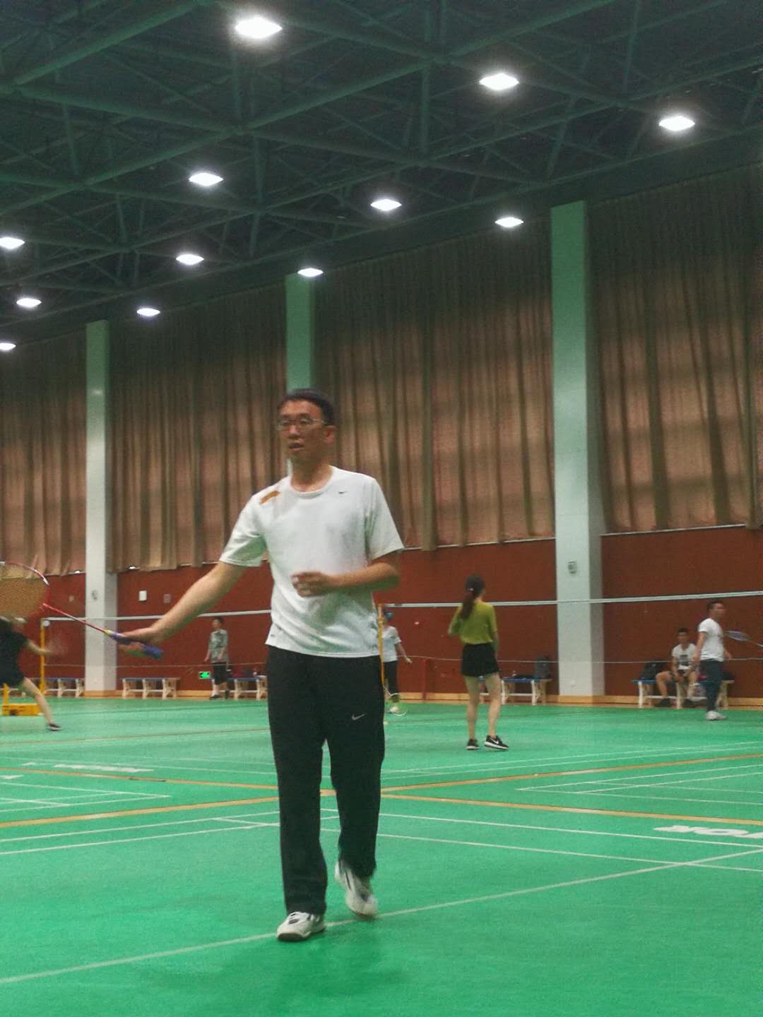 对于其中的三位老师,个个都是羽毛球高手,都是深藏不露,王学君老师和周宏老师看着瘦弱,但是挥拍动作和技巧性让人深信他们是经常打球的运动达人。最让我惊叹的是夏德峰老师,在我们大家都精疲力尽的时候,夏老师还能以一打二,还能打出一些难度较高的球,所以说夏老师应该是一位体力与技巧并存的羽毛球高手。