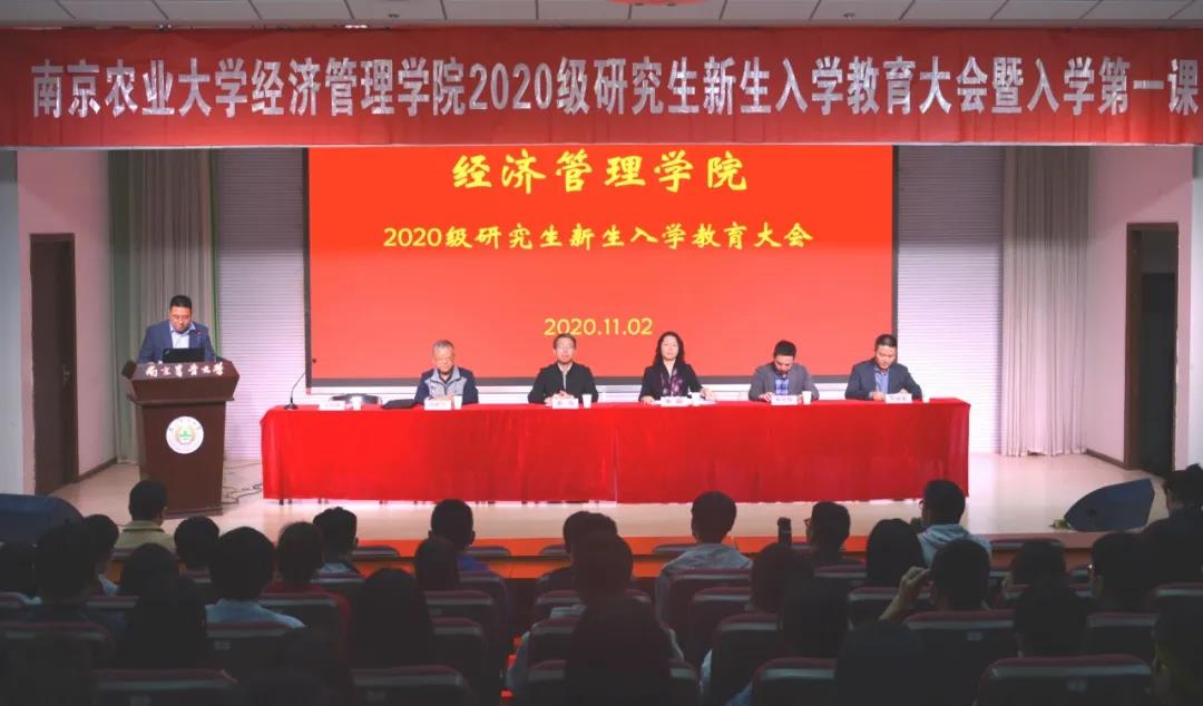 2020年11月2日晚上18:30,经管院2020级研究生入学教育大会暨入学第一课在教四楼报告厅举行。学院党委书记姜海教授、院长朱晶教授、校学术委员会副主任钟甫宁教授、院党委副书记宋俊峰、副院长林光华教授、副院长易福金教授及辅导员路行老师、梁雨桐老师出席了本次大会,全院159名2020级研究生新生到场聆听。大会由宋俊峰副书记主持。